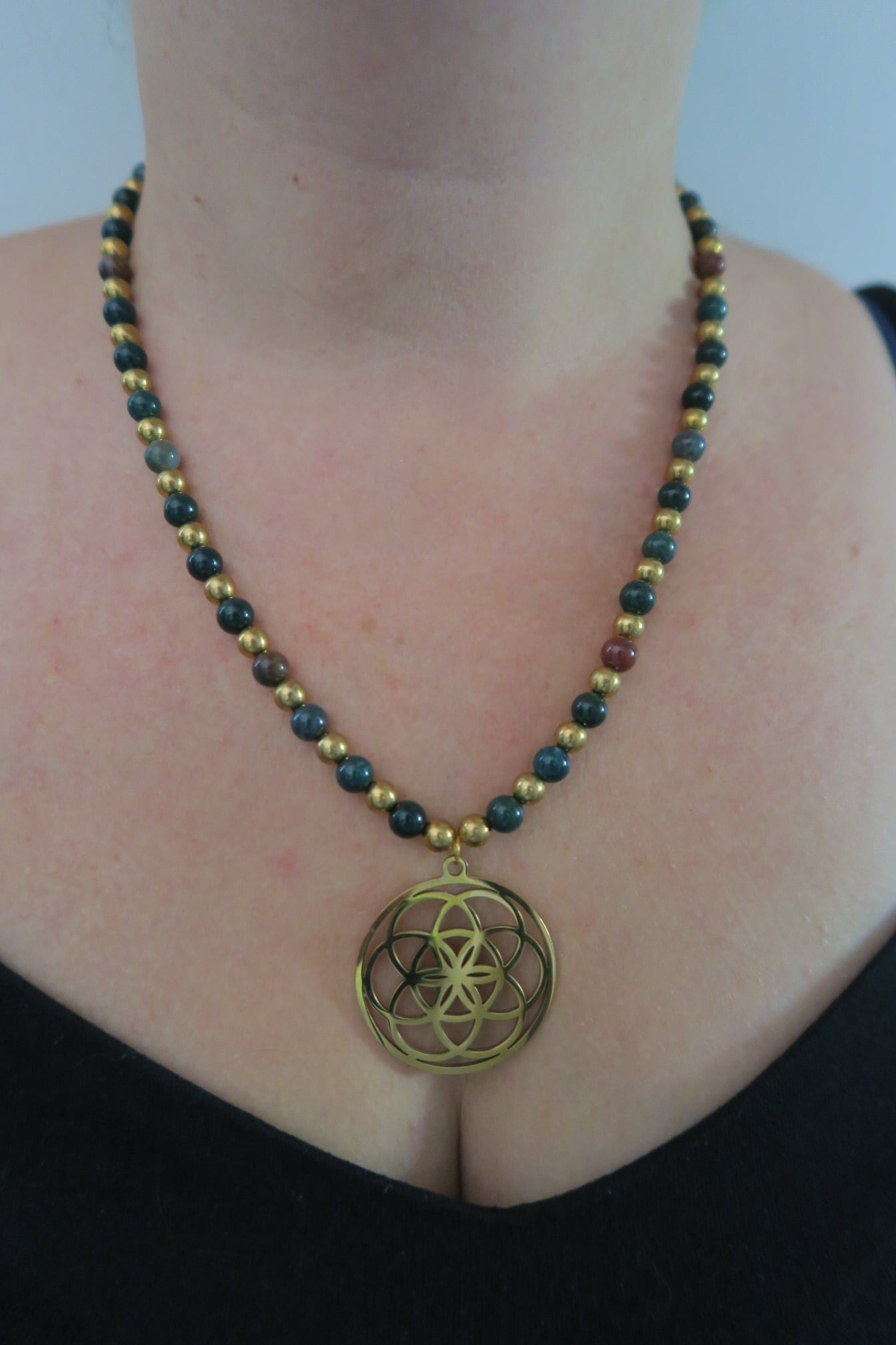 Descriptif : Collier fil acier très résistant en pierres naturelles ; 40 perles agate indienne en 6 mm, 22 billes intercalaires dorées, un fermoir en acier et un pendentif graine de vie 3.8 cm de diamètre. Longueur nuque pendentif 29 cm environ.
