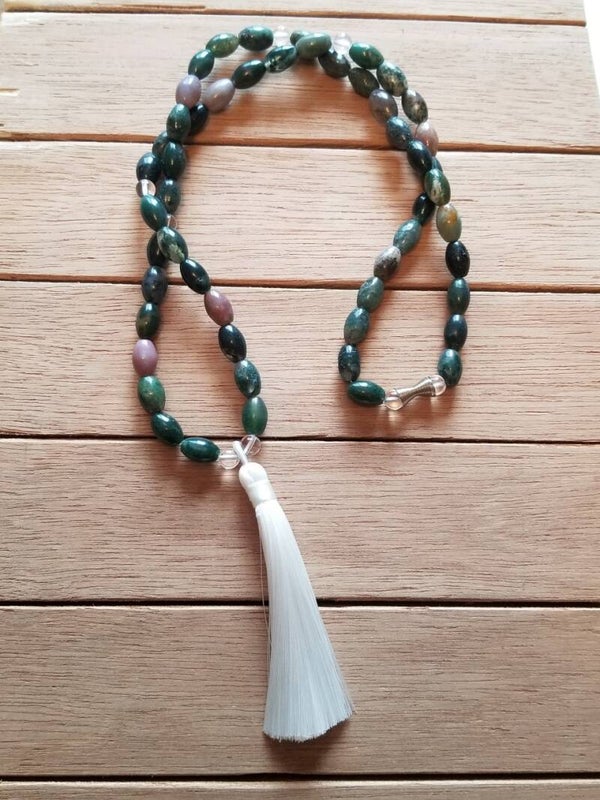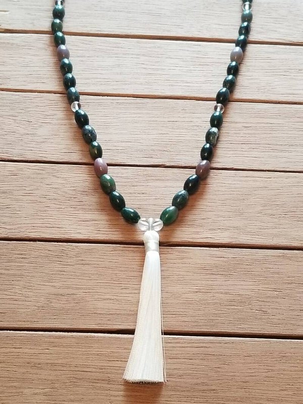 Descriptif : Monté sur fil en coton ; 52 perles olive en agate indienne, 8 perles en cristal de roche 6 mm, un cône cache nœud argenté & 1 pompon blanc de 8 cm. longueur nuque pompon 43 cm environ.