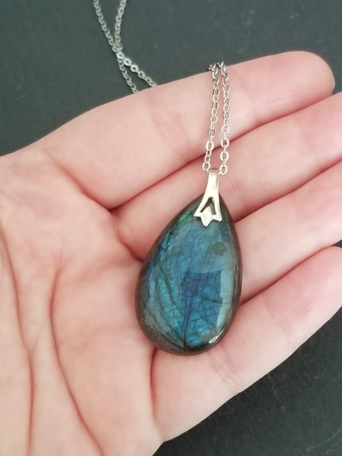 Descriptif : Collier labradorite 4 cm, monté avec bélière & chaine en acier inoxydable argenté longueur du bout du pendentif à la nuque : 35 cm environ.
