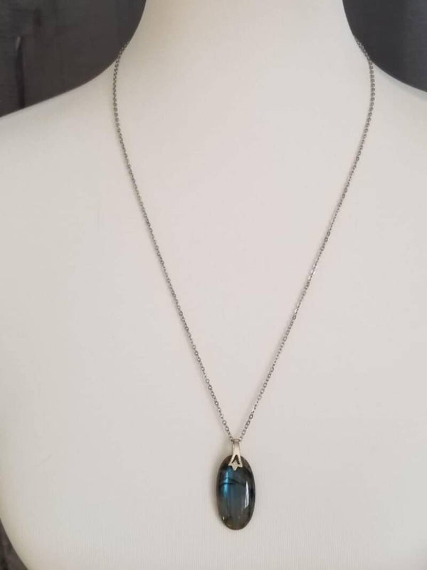 Descriptif : Collier labradorite 3 cm, monté avec bélière & chaine en acier inoxydable argenté longueur du bout du pendentif à la nuque : 34 cm environ.