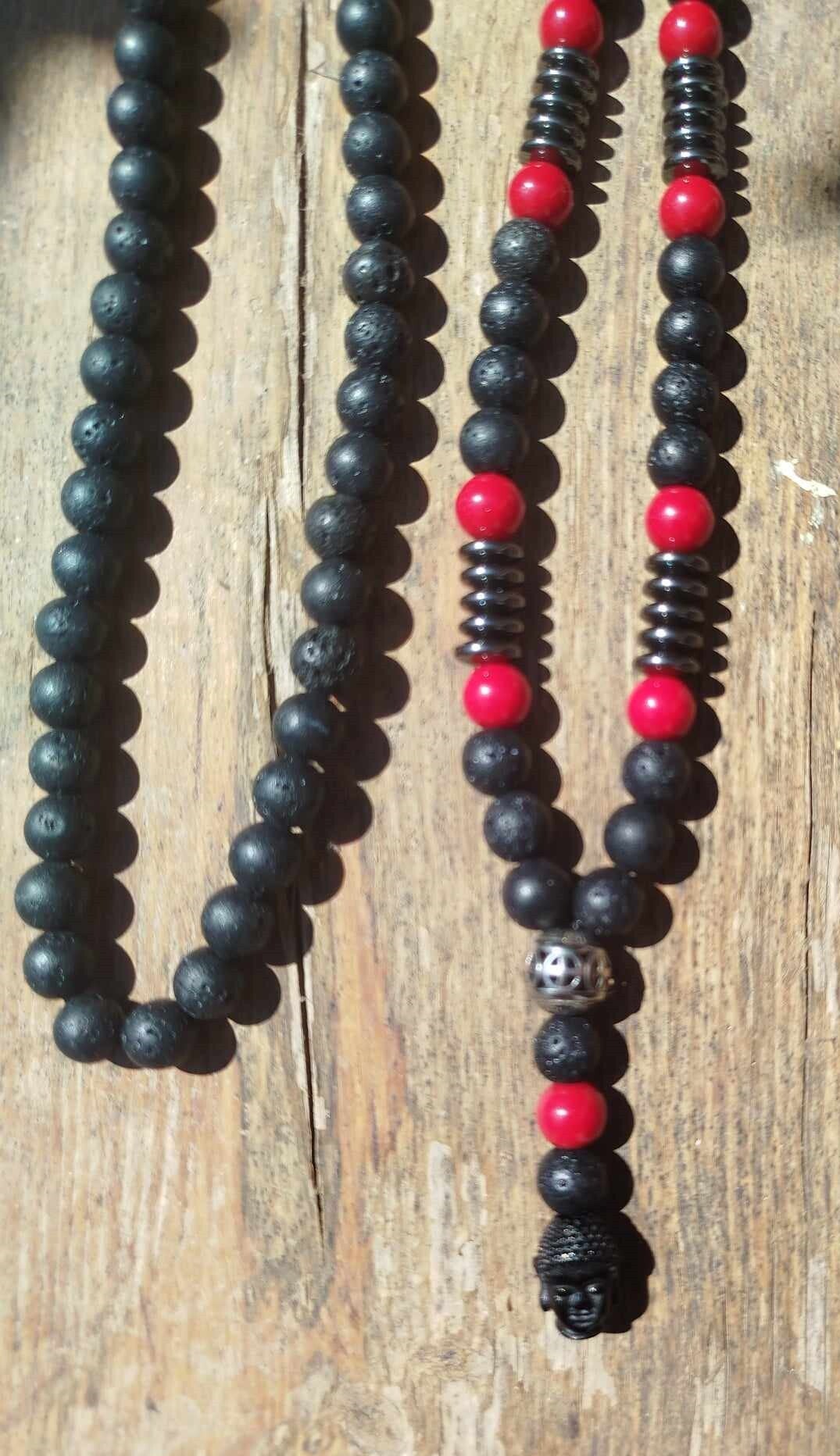 Description : ce collier est composé de perles de laves 8 mm, de perles jade rouge 8 mm , d'anneaux en hématite, d'une perle intercalaire 10 mm et d'une tête de bouddha noire. Il mesure 46 cm et est monté sur du fil en nylon.