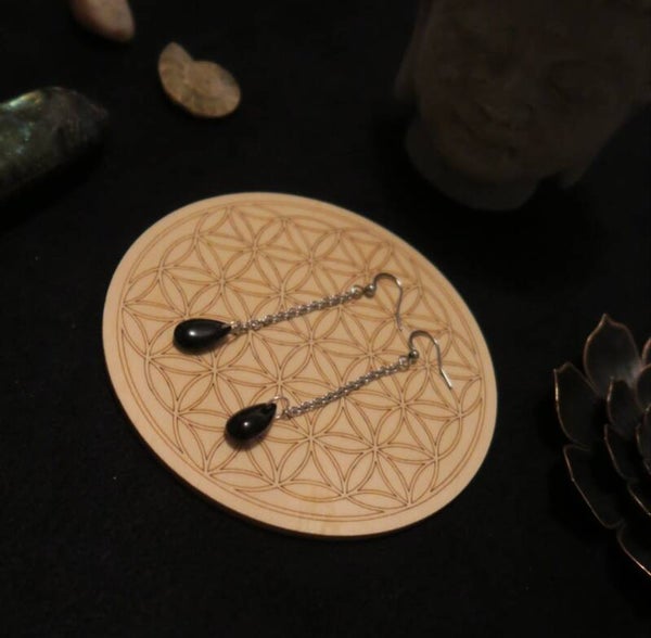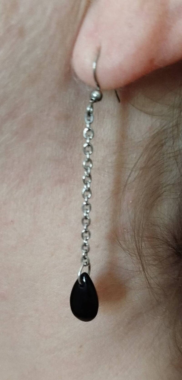 Descriptif : Boucles d'oreilles perles de verre en forme de goutte noire, longueur 6.5 cm, éléments métalliques en acier inoxydable.
