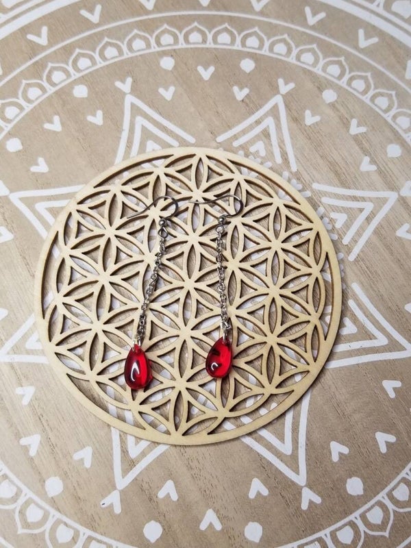 Descriptif : Boucles d'oreilles perles de verre en forme de goutte rouge, longueur 6.5 cm, éléments métalliques en acier inoxydable.