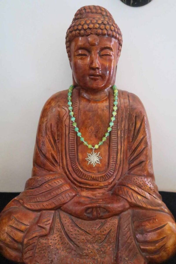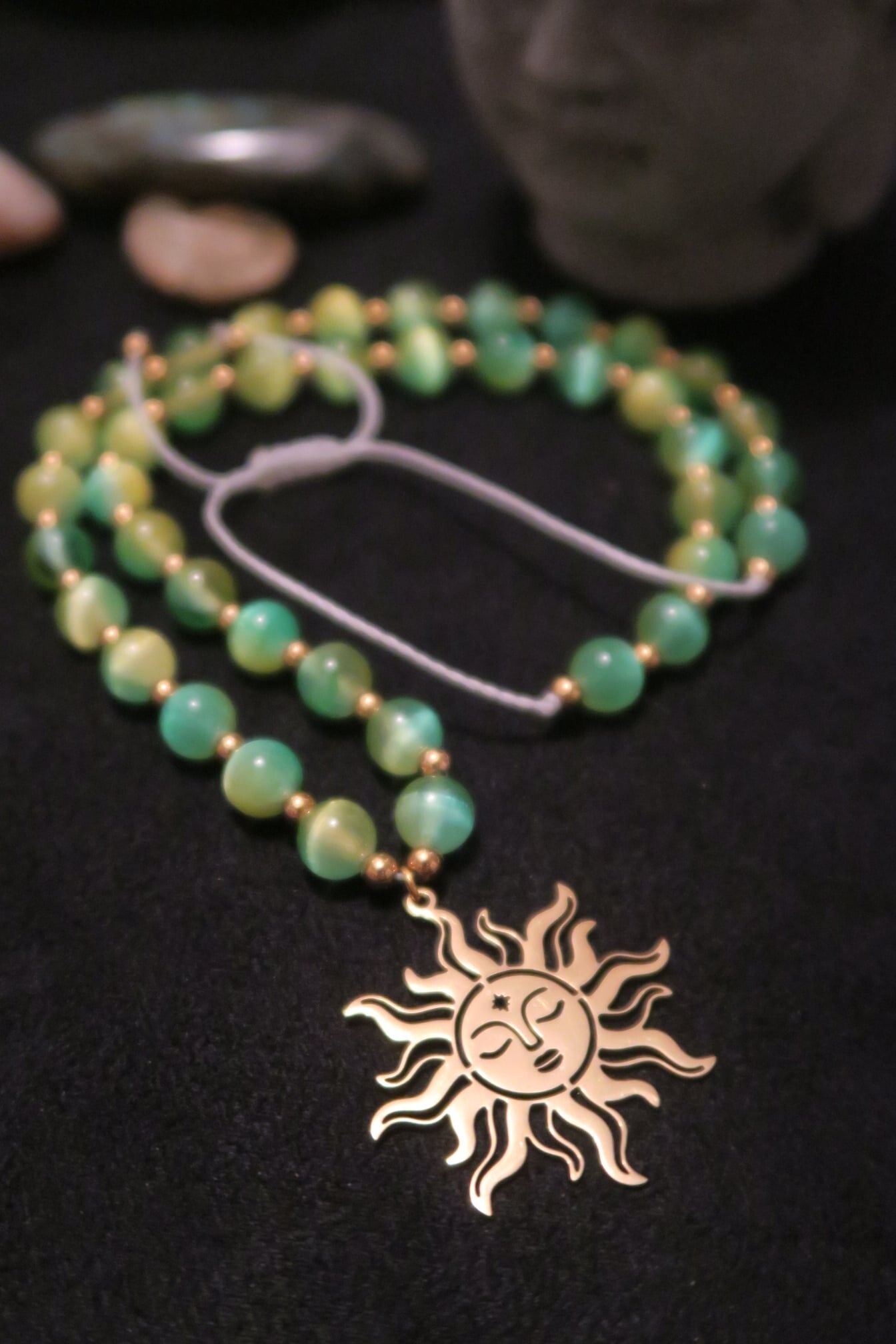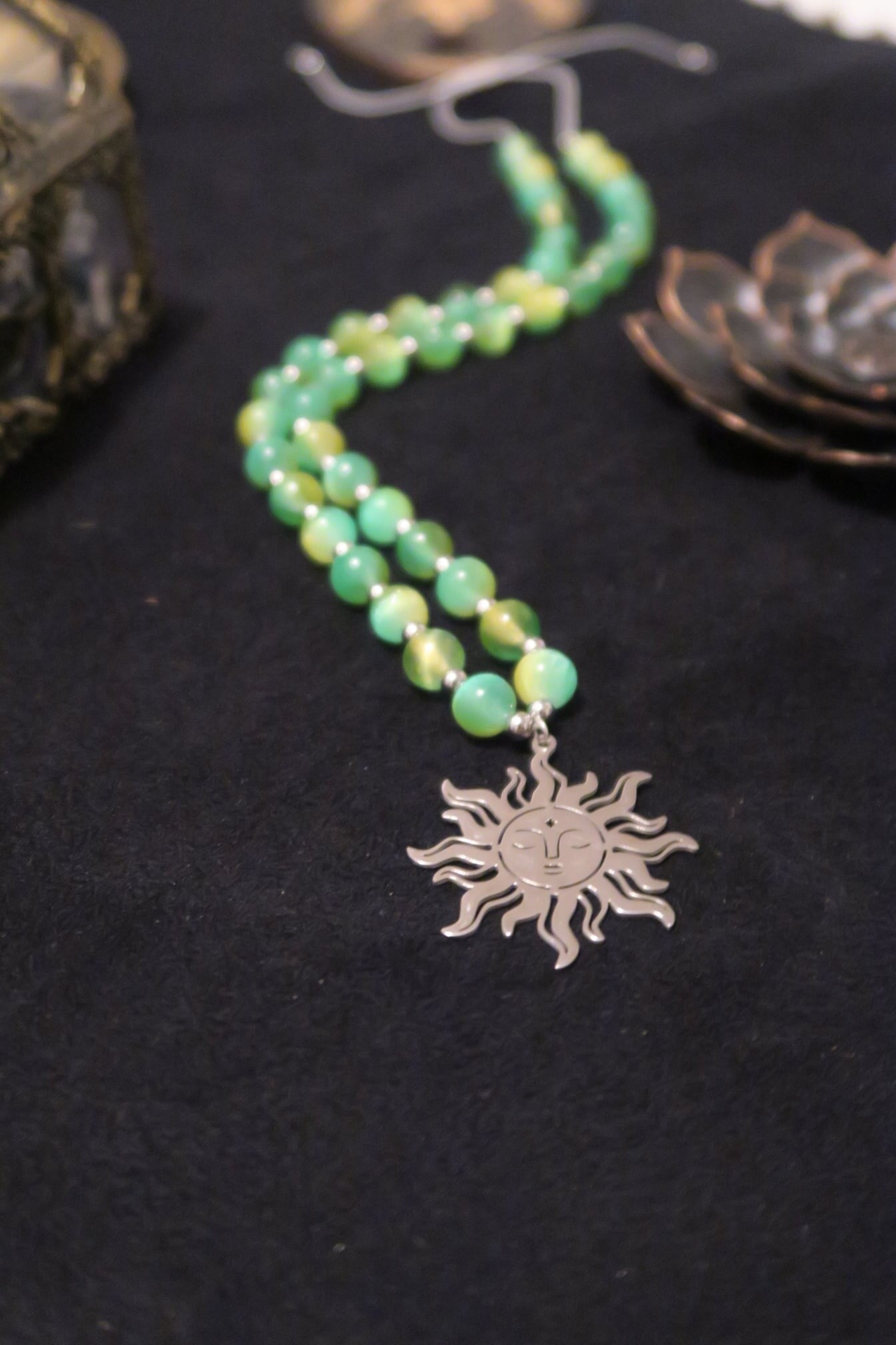 Descriptif : Collier monté sur fil tressé ciré blanc composé de 40 perles en sélénite du Mexique 8 mm, de 42 billes en acier inoxydable argenté de 4 mm & d'un pendentif soleil argenté en acier inoxydable de 4 cm. Grâce à son nœud coulissant en macramé, le collier est réglable allant de 26.5 cm à 36.5 cm.