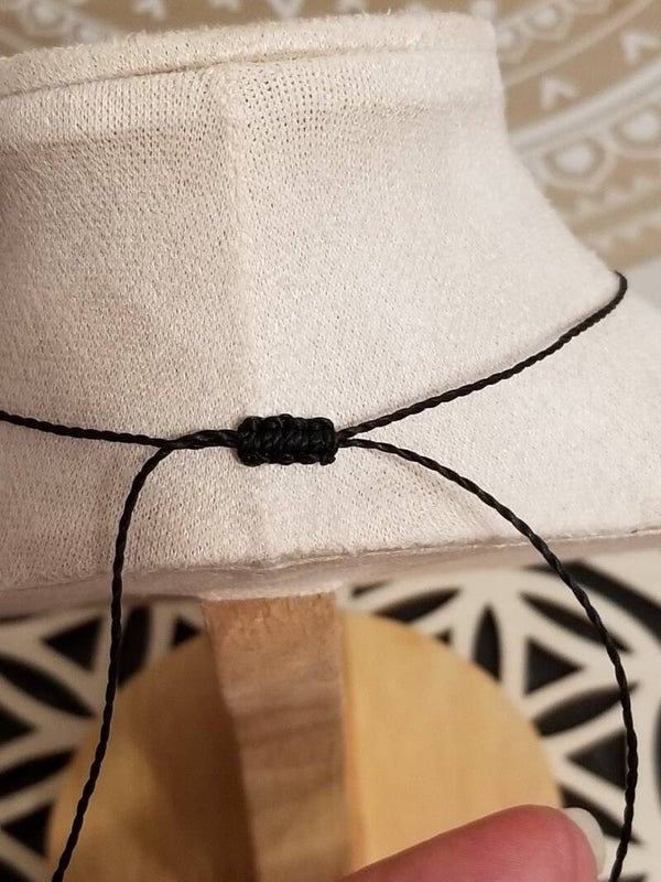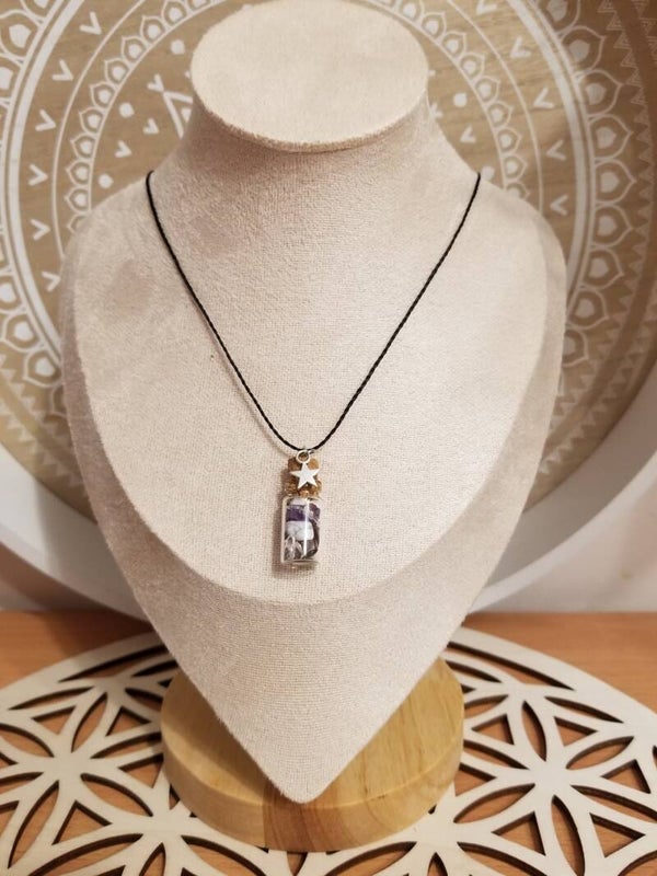 Fiole en verre de 3 cm de hauteur, monté sur fil macramé ciré torsadé noir, longueur max bas de la fiole au cou 38 cm, réglable grâce à son nœud coulissant en macramé.