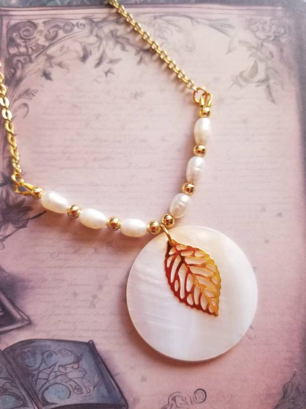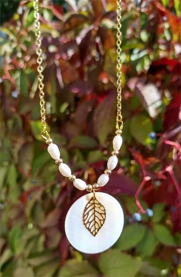 Descriptif : Ce collier fin et raffiné est composé de perles d'eau douce et d'un pendentif rond en nacre blanche de 3.5 cm. Les éléments métalliques sont en acier inoxydable doré. Longueur cou bout pendentif : 25 cm + rallonge de 5 cm.