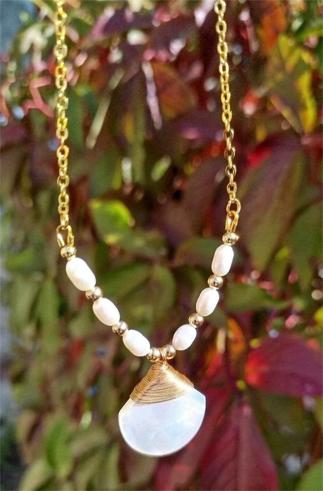Descriptif : Ce collier fin et raffiné est composé de perles d'eau douce et d'un pendentif en forme de coquillage en nacre blanche de 2.7 cm. Les éléments métalliques sont en acier inoxydable doré. Longueur cou bout pendentif : 25 cm + rallonge de 5 cm.