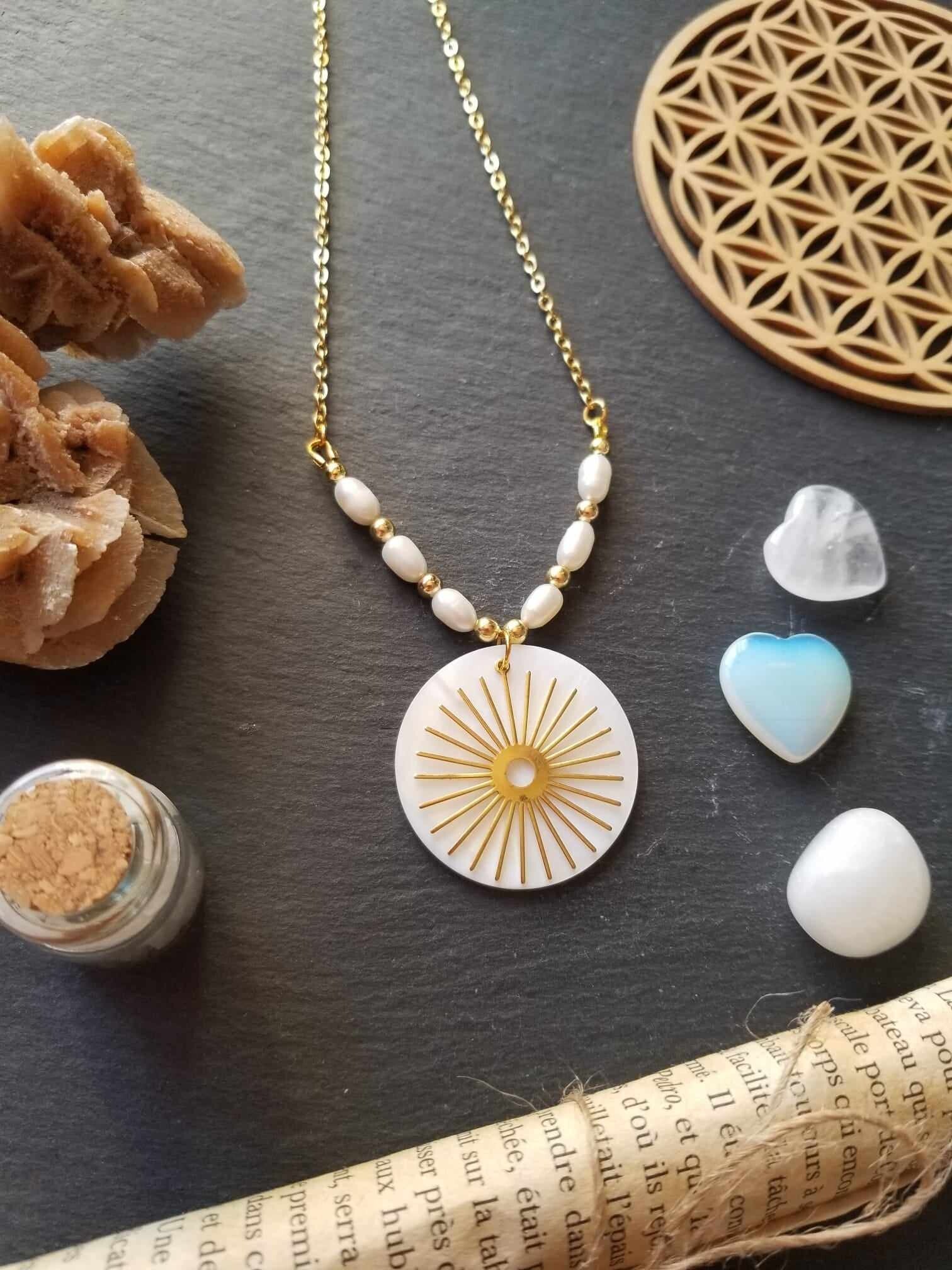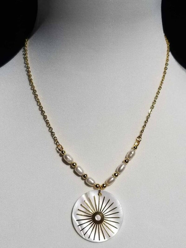 Description : Ce collier fin et raffiné est composé de perles d'eau douce et d'un pendentif rond en nacre blanche de 3.5 cm. Les éléments métalliques sont en acier inoxydable doré. Longueur cou bout pendentif : 25 cm + rallonge de 5 cm.