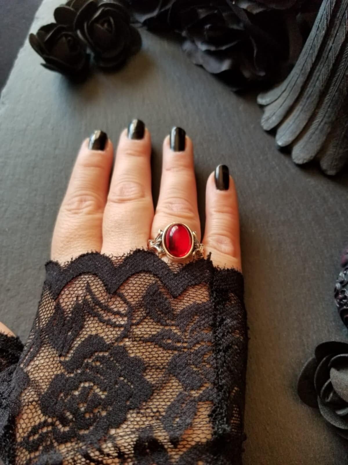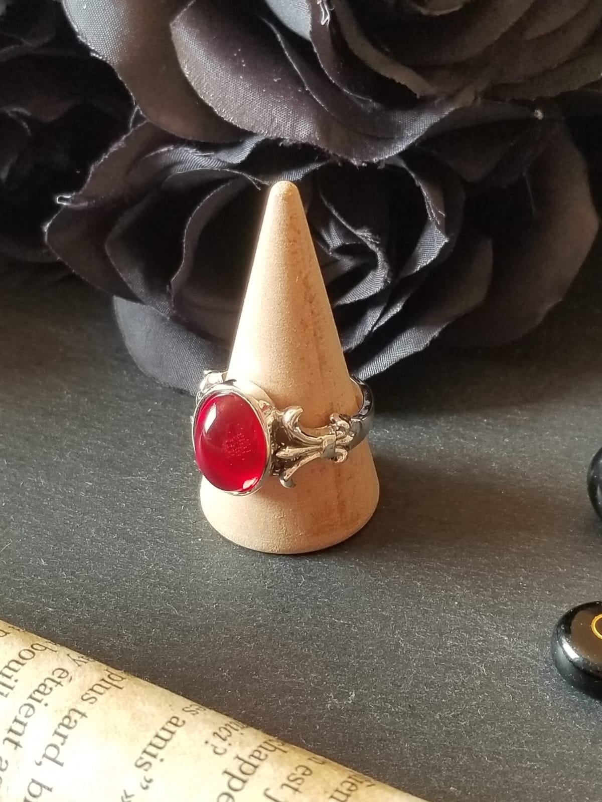 Descriptif : Bague en alliage sertie d'un cabochon en verre rouge sang.