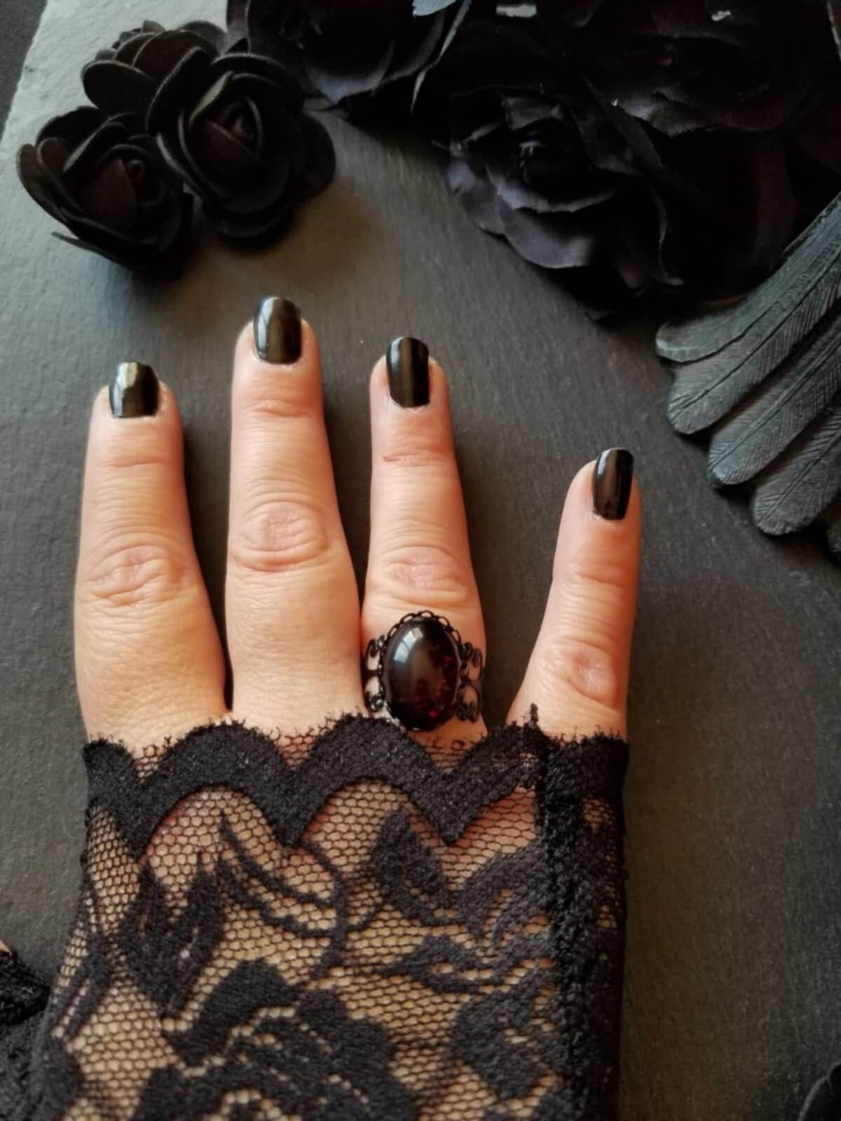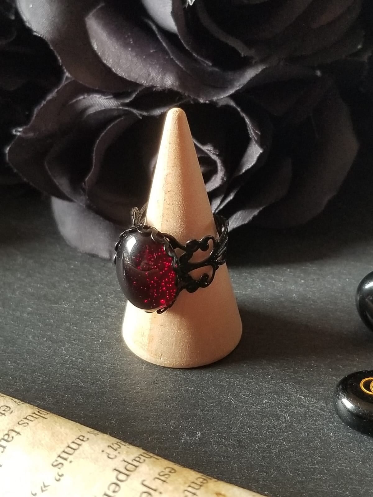 Descriptif : Bague réglable en dentelle noire (alliage) sertie d'un cabochon en verre rouge.
