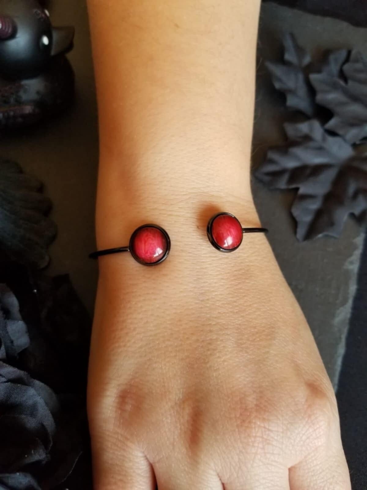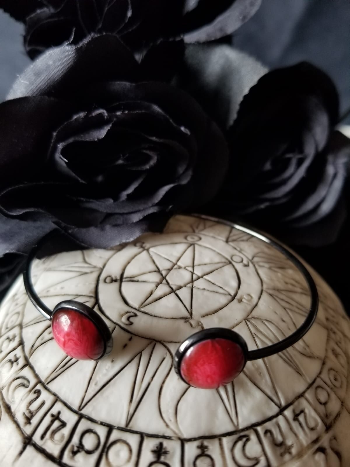 Descriptif : Jonc en acier inoxydable noir cabochons en résine rouge.