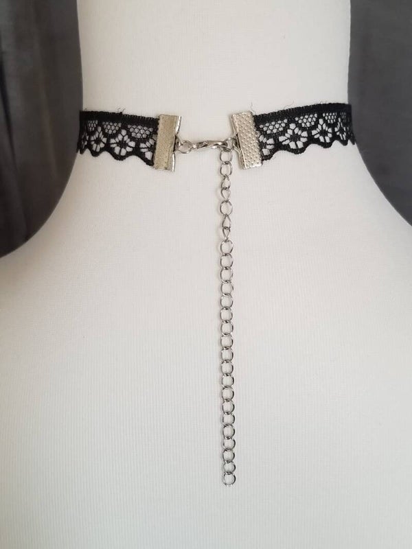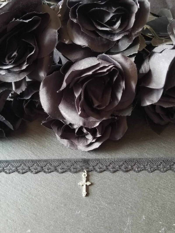 Descriptif : Ras de cou en dentelle noire (1 à 1.3 cm d'épaisseur) et sa breloque croix argentée. Longueur 30 cm + rallonge de 10 cm.
