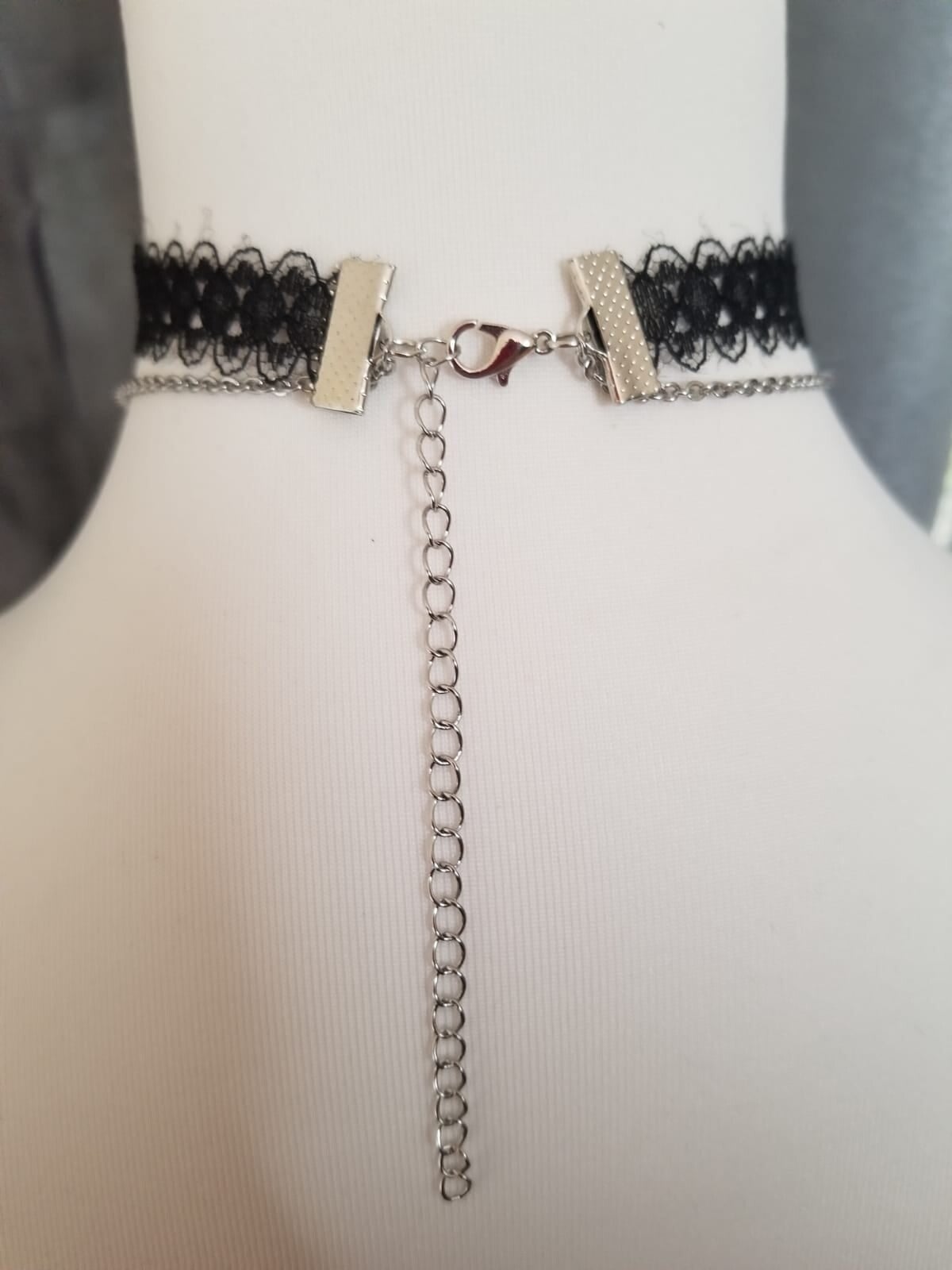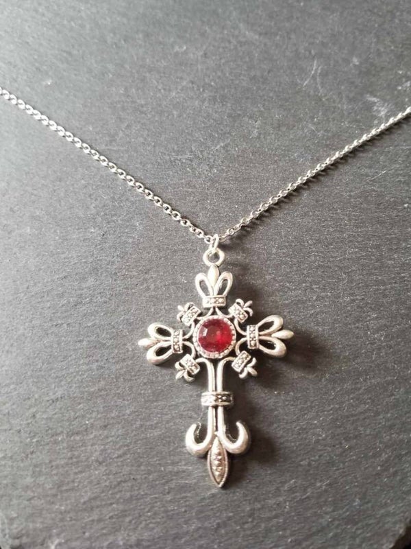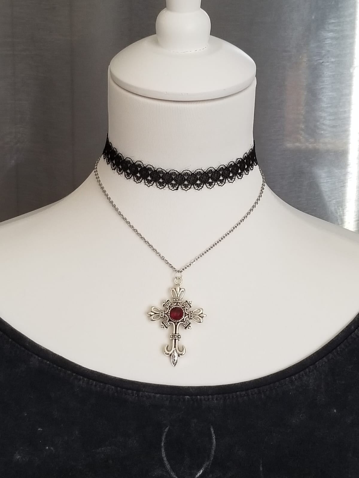 Descriptif : Double collier composé d'un ras de cou en dentelle noire (1.8 cm d'épaisseur), d'une chaine en acier inoxydable terminée par sa breloque croix en alliage & son cabochon rouge en résine. Longueur 30 cm + rallonge de 10 cm.