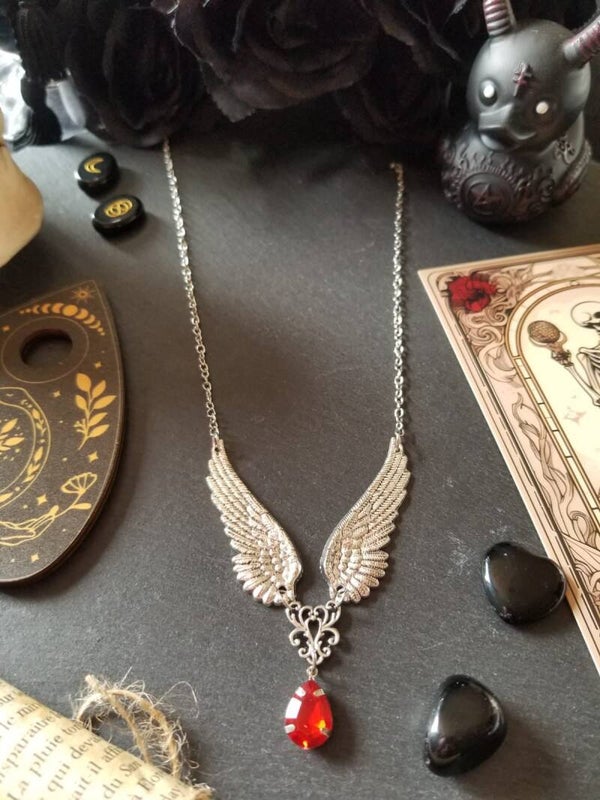 Descriptif : Collier ailes en alliage, goutte en acrylique rouge. Longueur base cou au bout pendentif 33 cm.