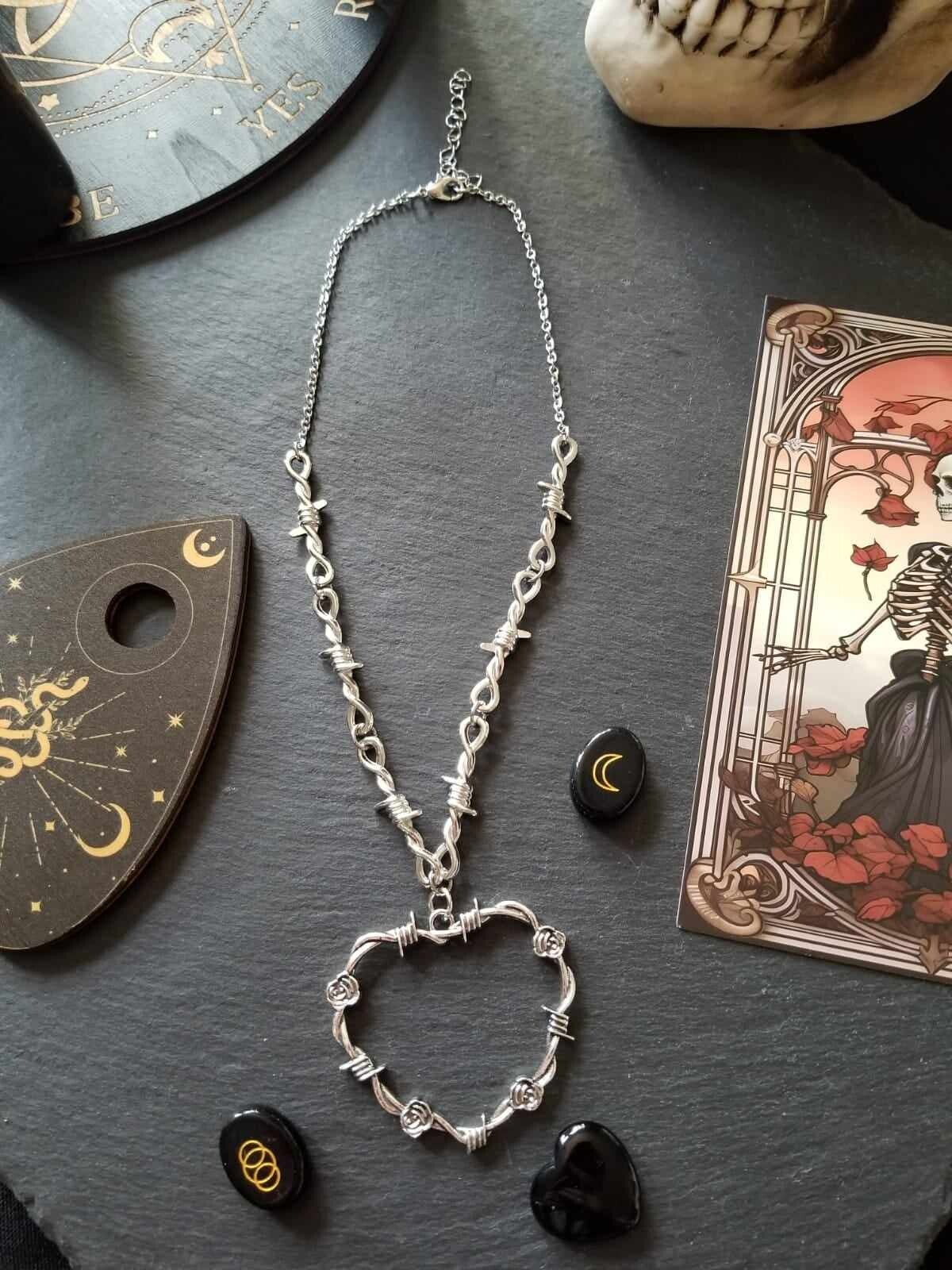 Descriptif : Collier barbelés & cœur en alliage, reste des éléments métalliques en acier inoxydable. Longueur base cou au bout pendentif 23 cm. + 5 cm de rallonge