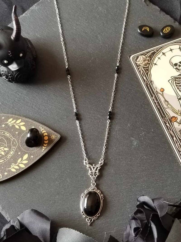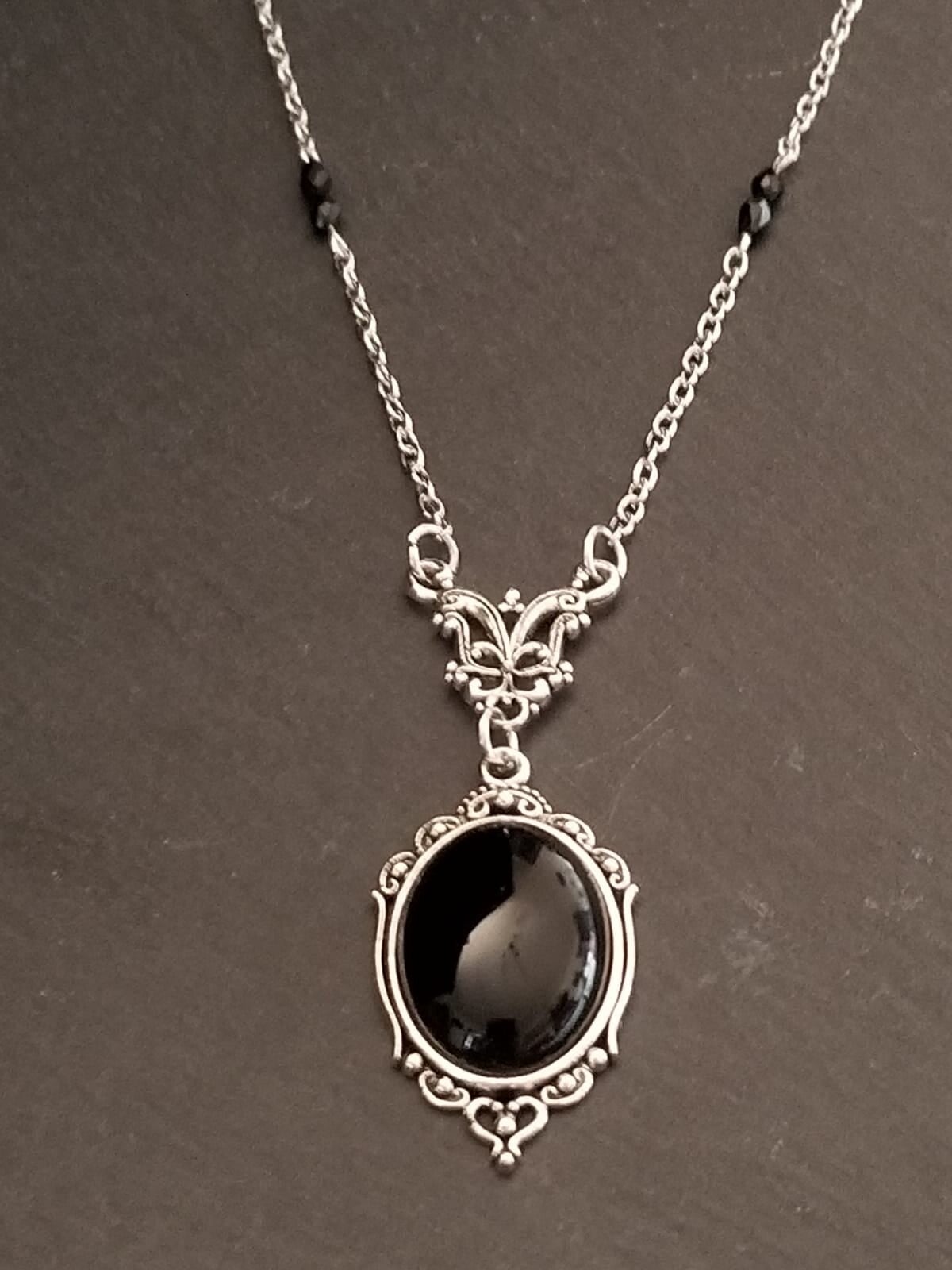 Descriptif : Collier vintage en alliage, pendentif en verre noir et perles de verre facettées 5 mm noires. Longueur base cou au bout pendentif 33 cm.