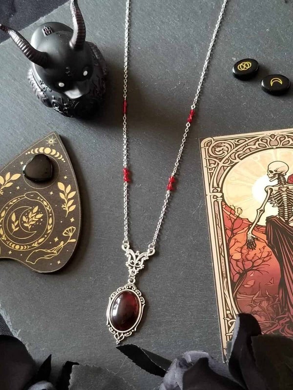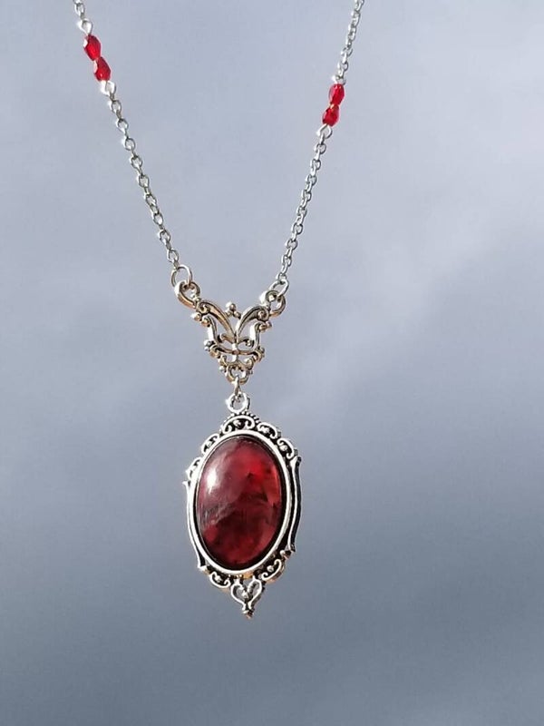 Descriptif : Collier vintage en alliage, pendentif en verre rouge et perles de verre facettées 5 mm rouges. Longueur base cou au bout pendentif 31.5 cm.