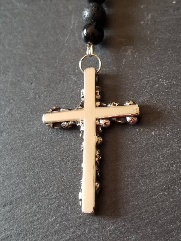Descriptif : Chapelet monté sur fil acier composé de 3 perles en jade rouge 8 mm, 45 perles en pierre de lave 8 mm, 43 perles en agate noire 8 mm, Cranes et perles d'espacement en alliage, croix de 5 cm en acier inoxydable. longueur base cou bout pendentif 50cm.