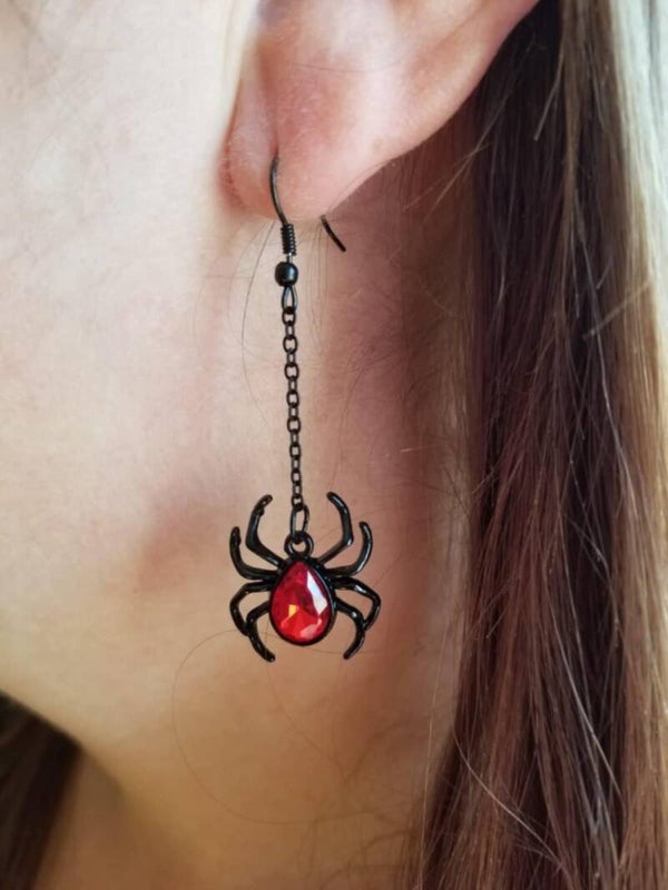 Descriptif : Boucles d'oreilles araignées en alliage noir, cabochons en verre rouge, autres éléments métalliques en acier inoxydable noir. Longueur 6 cm.