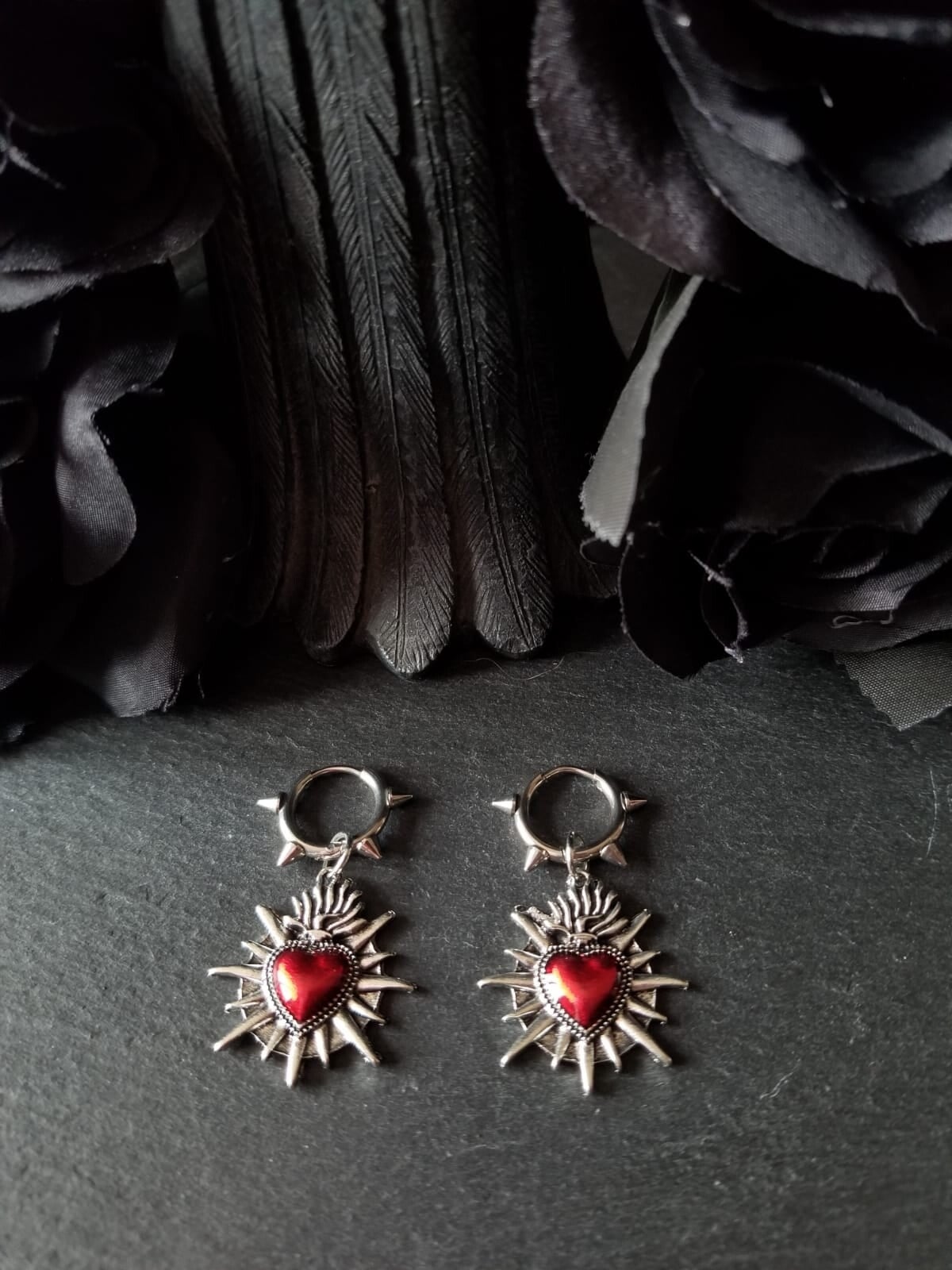 Descriptif : Créoles à pics en acier inoxydable avec ses pendants en alliage cœur rouge en émail. Longueur 3.5 cm.