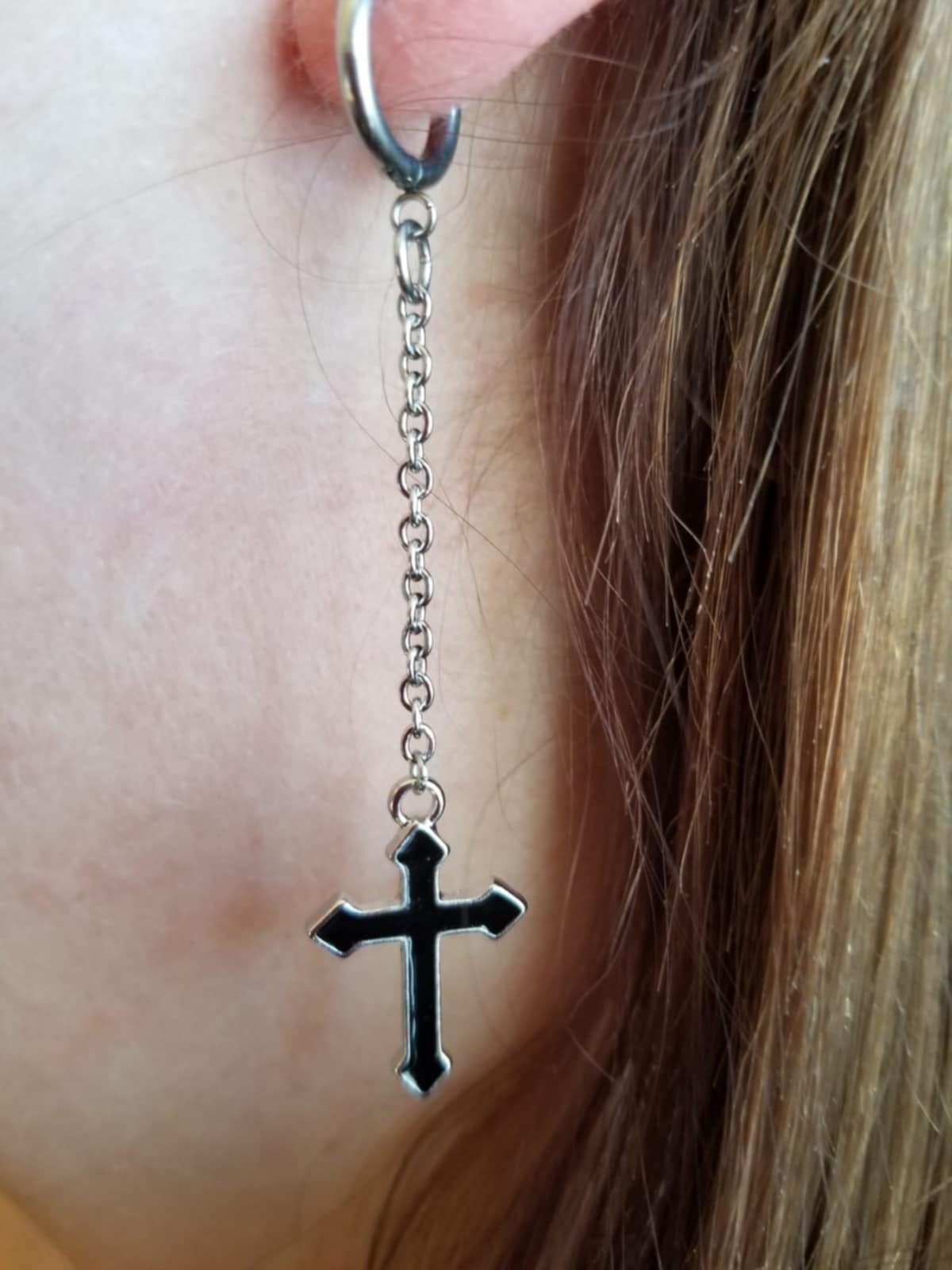 Descriptif : Créoles chaines en acier inoxydable avec croix noires en émail, une avec clip d'oreille. Longueur 7 cm.