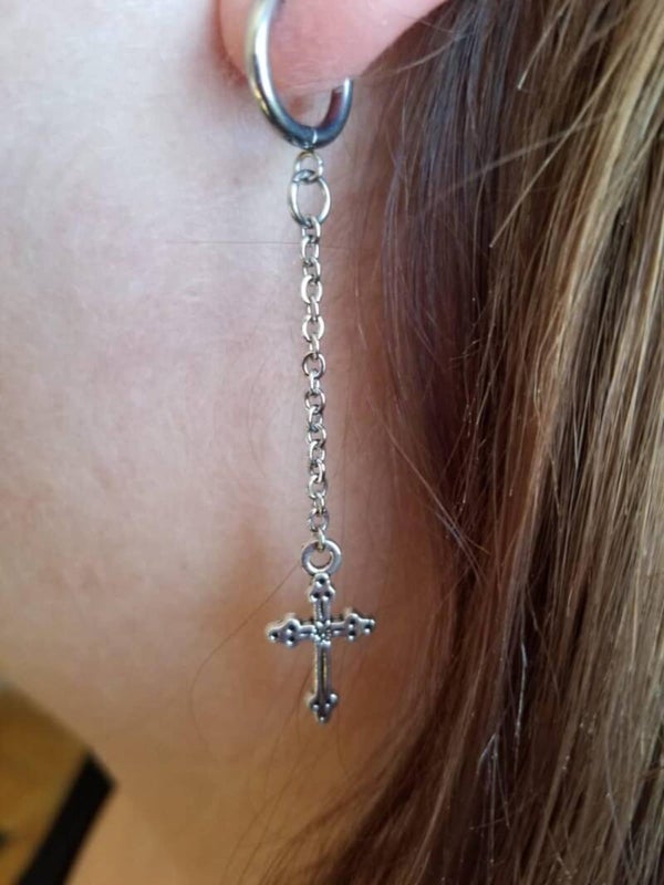Descriptif : Créoles chaines en acier inoxydable avec croix argentées en alliage, une avec clip d'oreille. Longueur 7 cm.