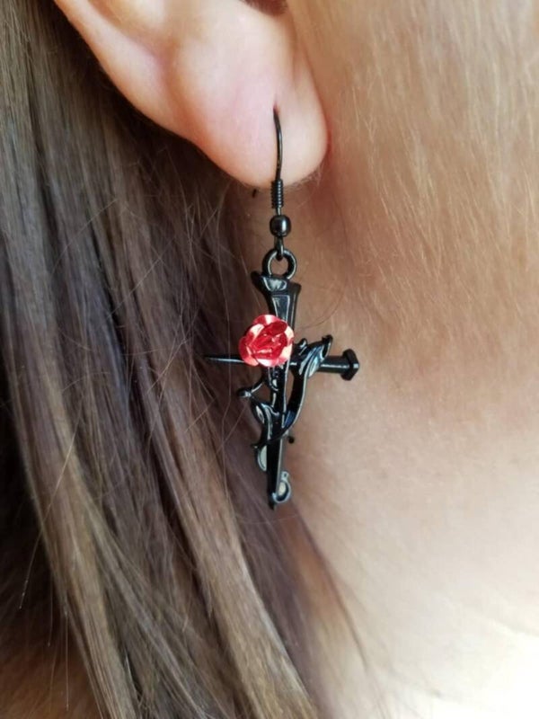 Descriptif : Boucles d'oreilles croix noires & roses rouges en alliage. Longueur 5 cm.