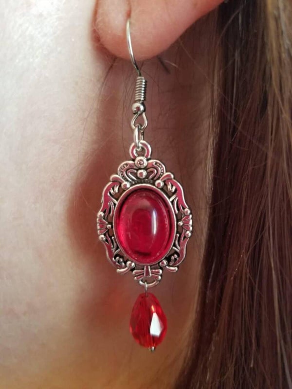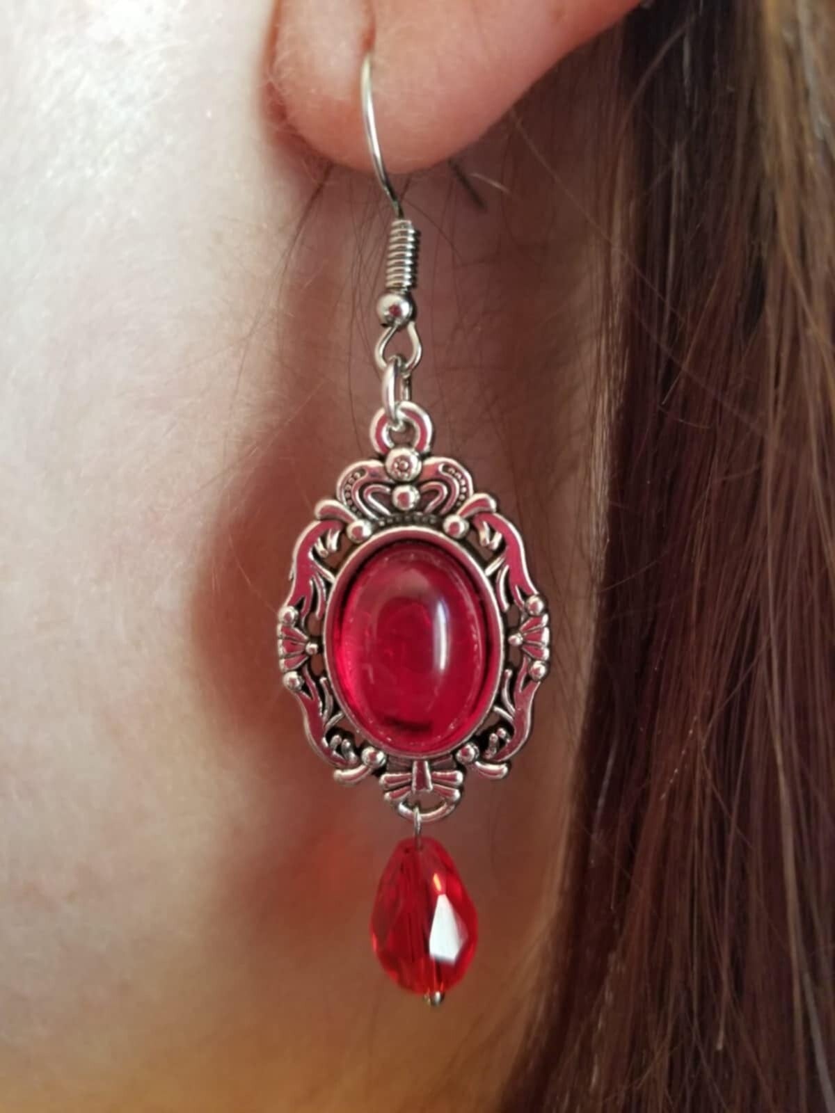 Descriptif : Boucles d'oreilles en alliage avec cabochons & perles de verre facettées rouges. Longueur 6 cm.