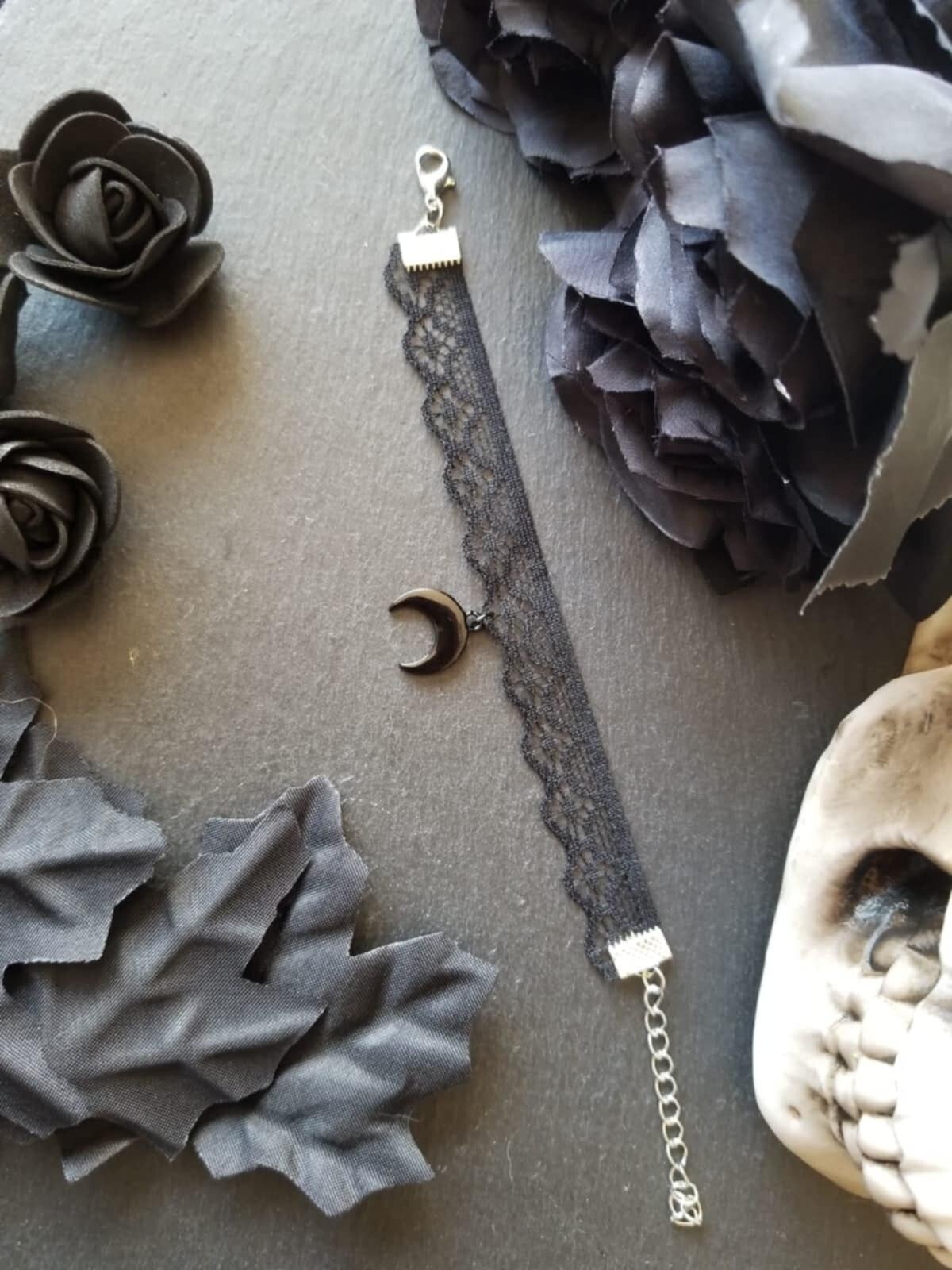 Descriptif : Bracelet en dentelle noire (1 à 1.3 cm d'épaisseur) et sa breloque lune noire. Longueur 15.5 cm + rallonge de 5 cm.