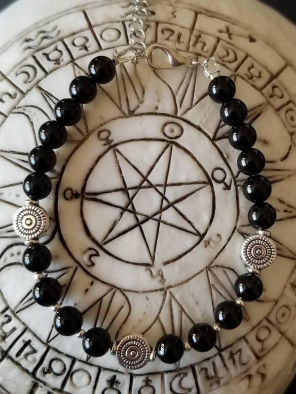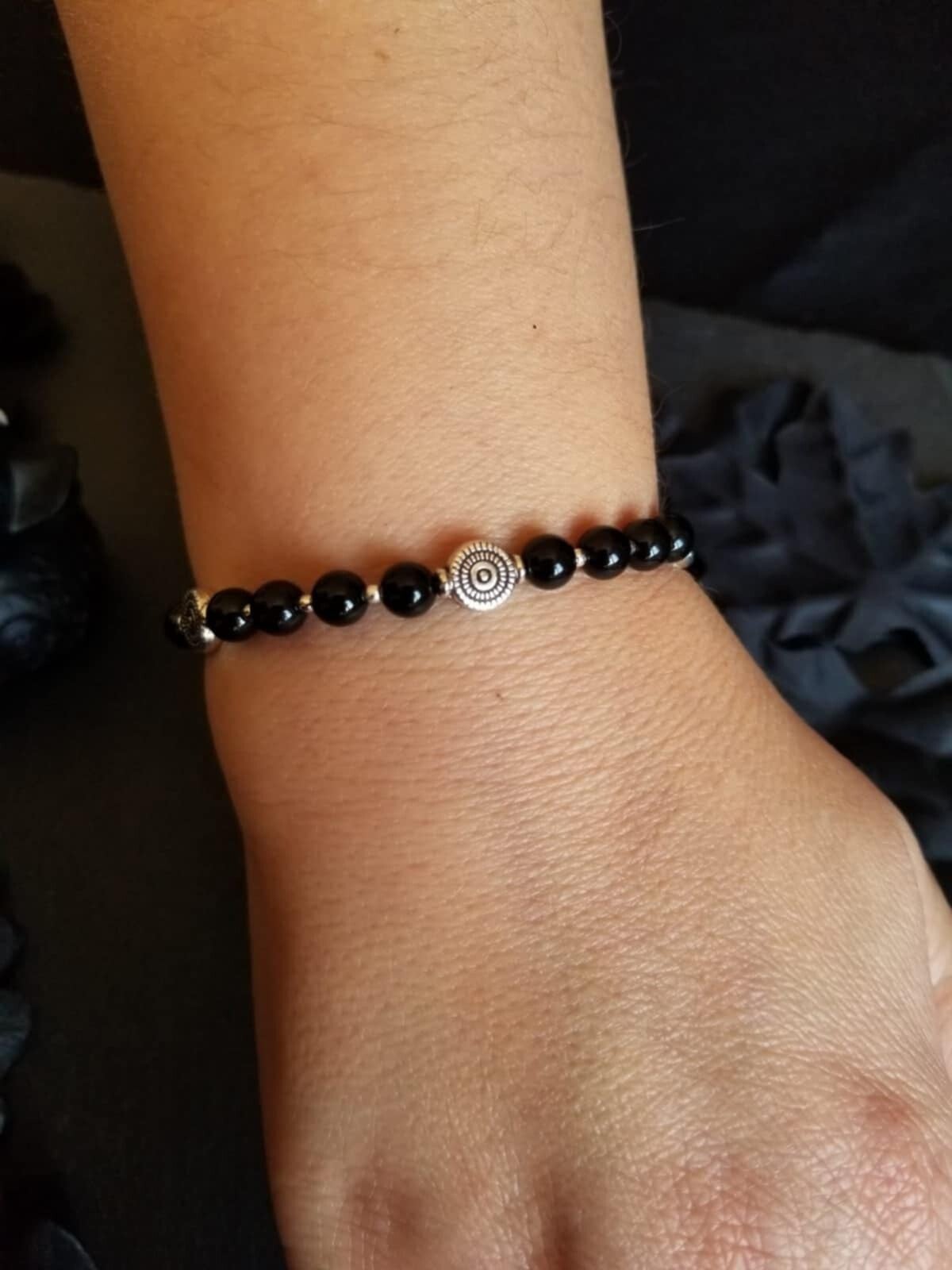 Descriptif : Bracelet monté sur fil acier composé de 20 perles d'agate noire en 6 mm, de spirales en alliage, les autres éléments métalliques sont en acier inoxydable. Longueur 16 cm + 5 cm de rallonge.