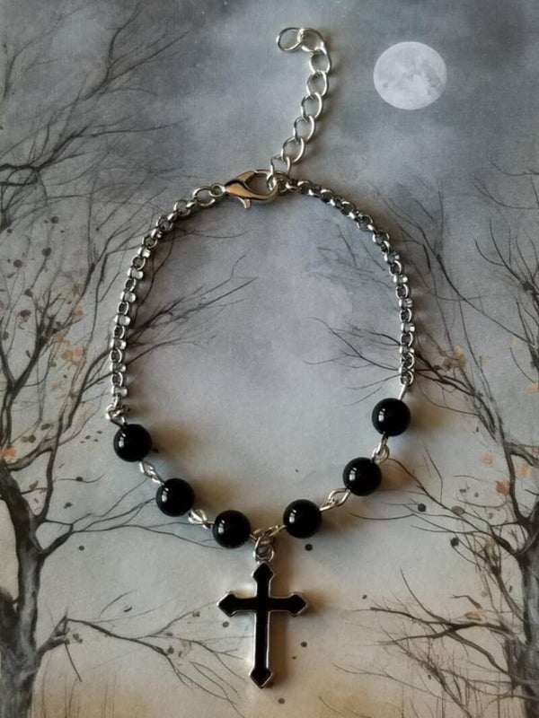 Descriptif : Bracelet chaine en acier inoxydable composé de perles d'agate noire en 6 mm & d'une croix en émail noire. Longueur 15 cm + rallonge de 5 cm.