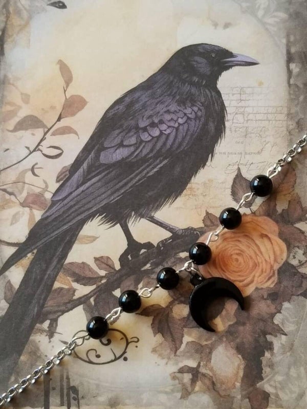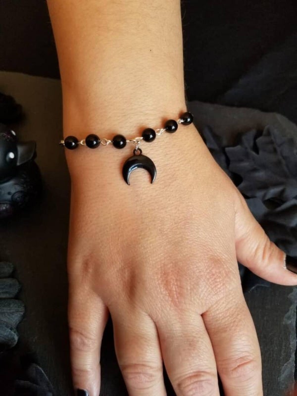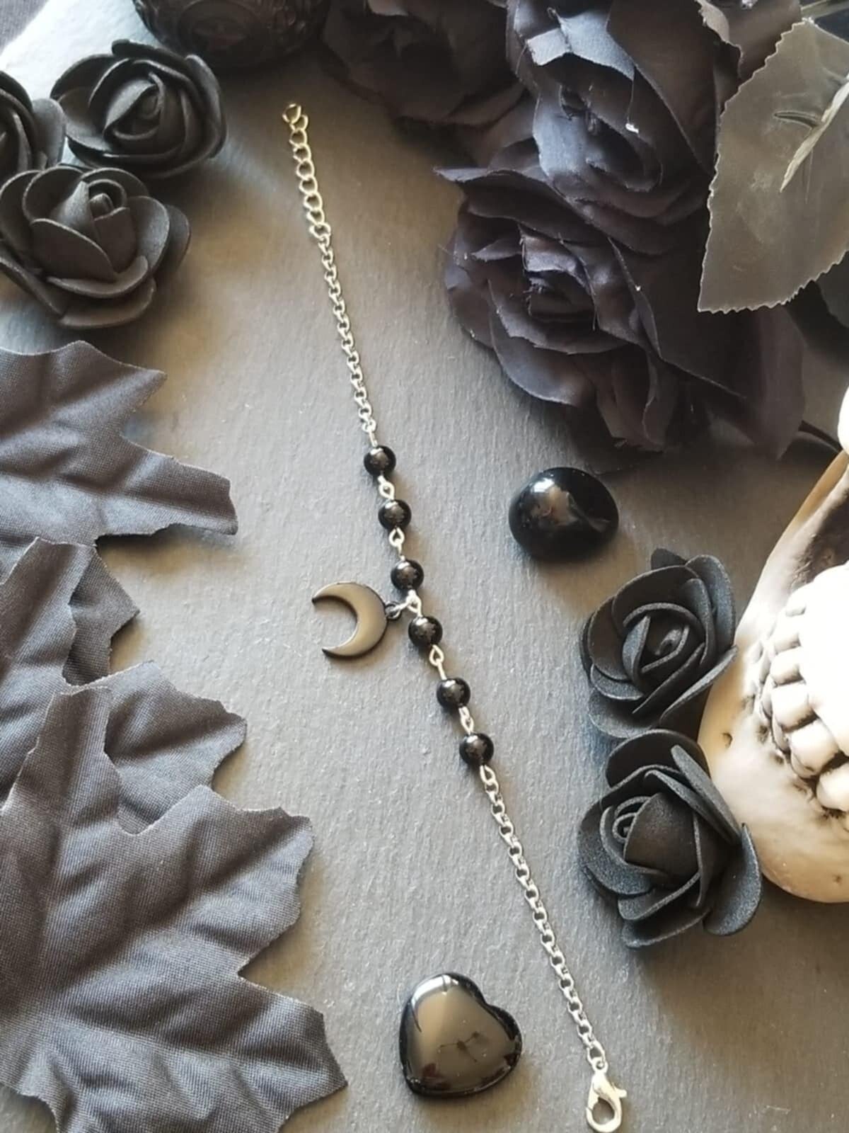 Descriptif : Bracelet chaine en acier inoxydable composé de perles d'agate noire en 6 mm & d'une lune en alliage noire. Longueur 15 cm + rallonge de 5 cm.