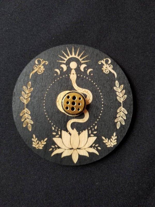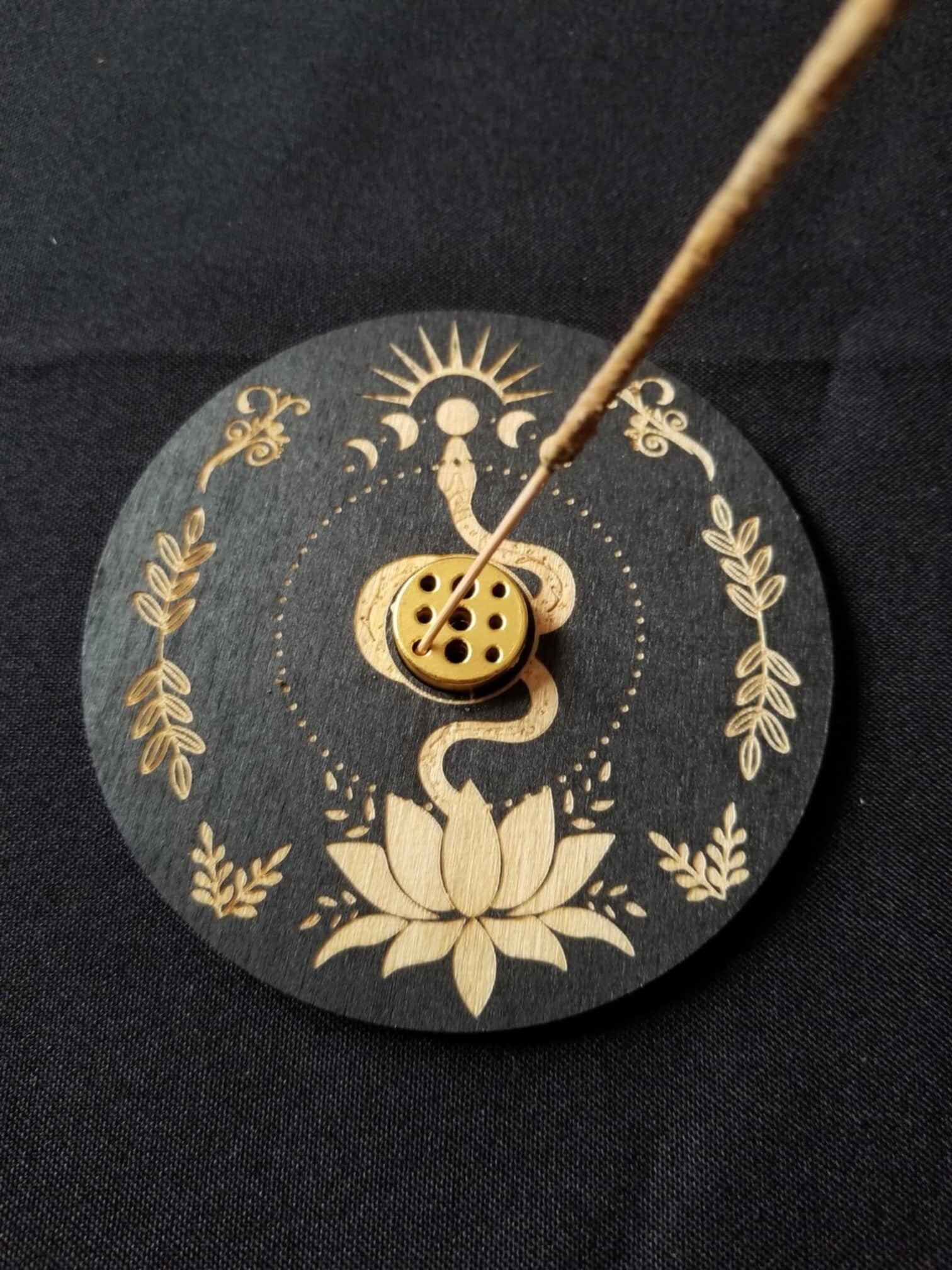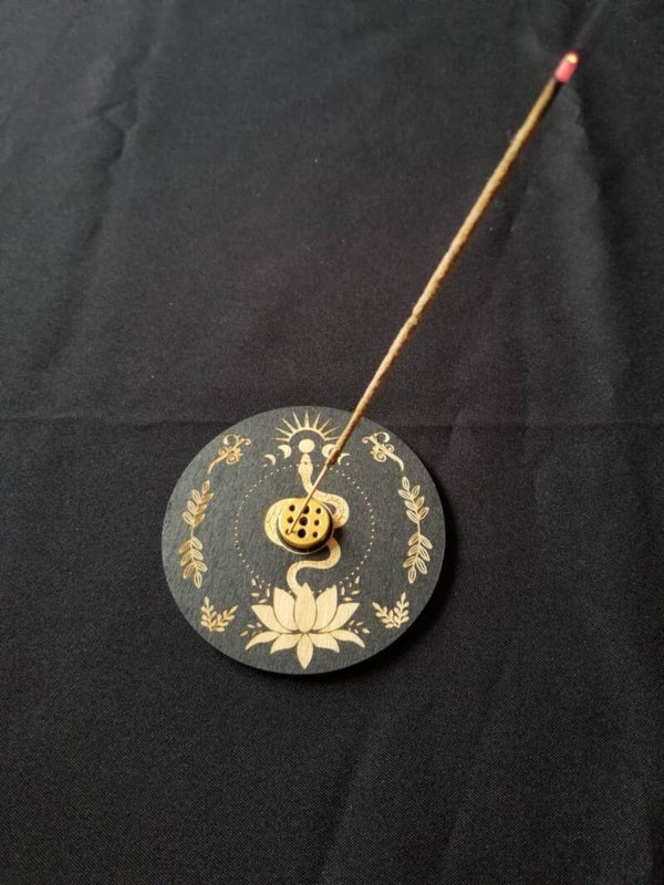 Descriptif : Porte encens en bois diamètre 10 cm, épaisseur 0.5 cm, plusieurs diamètres différents pour le bâton d'encens.