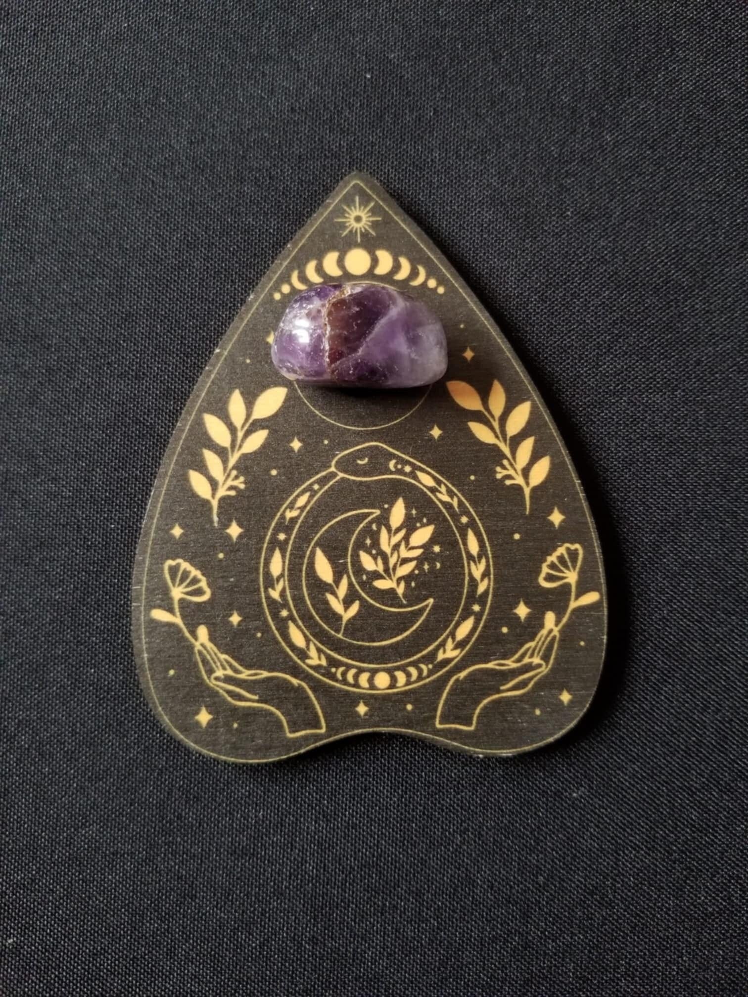 Descriptif : Ouija pointeur en bois, idéal pour la décoration ou pour support de pierres, 8 cm de hauteur.