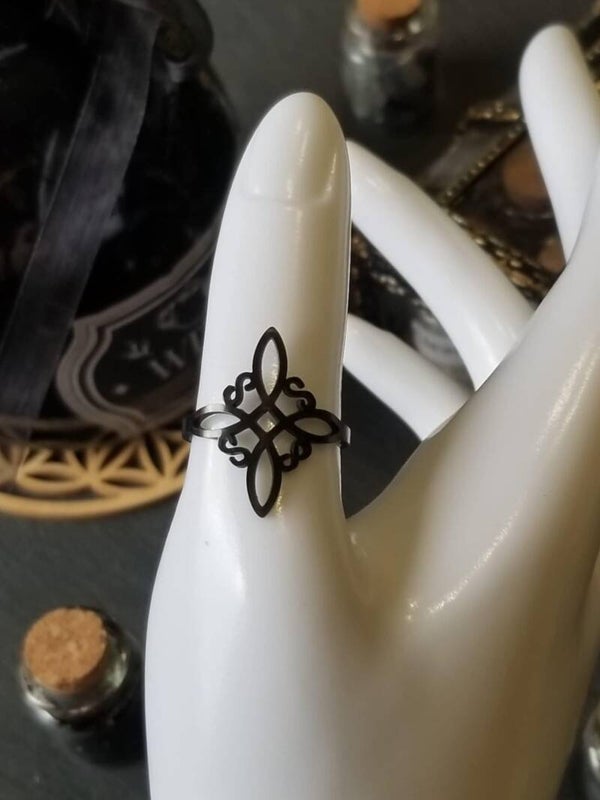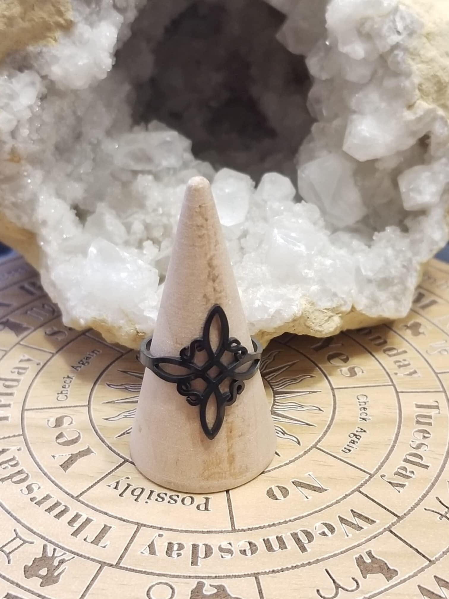 Bague en acier inoxydable nœud de sorcière réglable, existe aussi en argentée ou dorée.