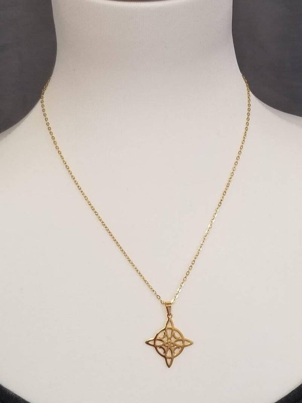 Descriptif : Chaine & pendentif nœud de sorcière de 2.5 cm environ en acier inoxydable. Longueur 44 cm + 5 cm de rallonge.