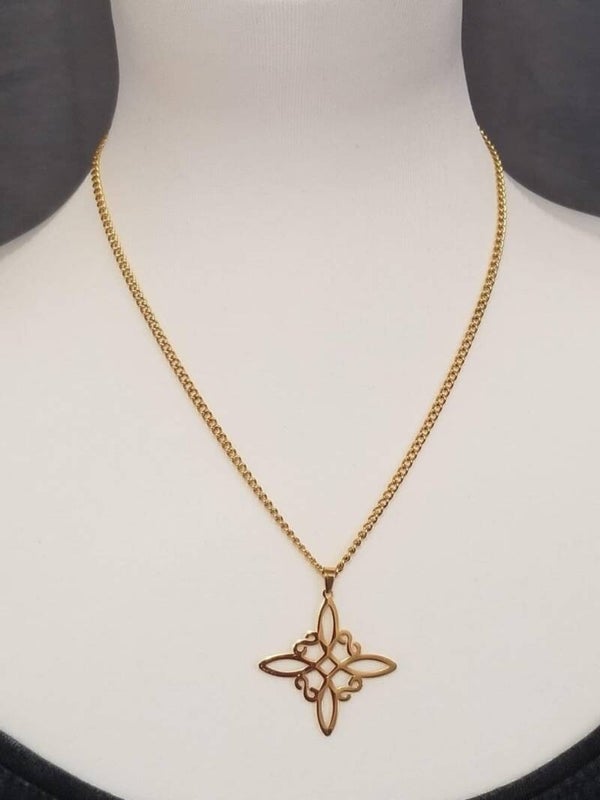 Descriptif : Chaine & pendentif nœud de sorcière de 3.5 cm environ en acier inoxydable. Longueur 45 cm + 5 cm de rallonge.