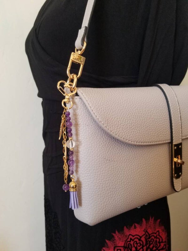 Descriptif : Bijou de sac doré avec perles en améthyste 6 & 8 mm, perle 10 mm en cristal de roche, éléments métalliques en alliage & acier inoxydable, pompon en cuir violet.
