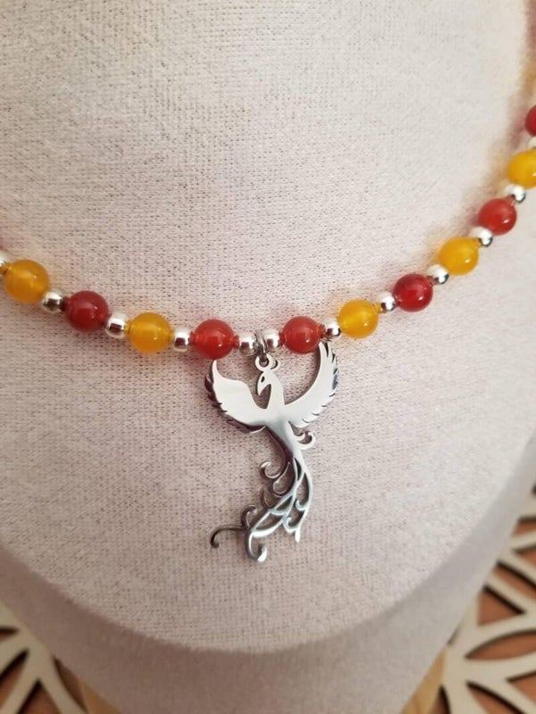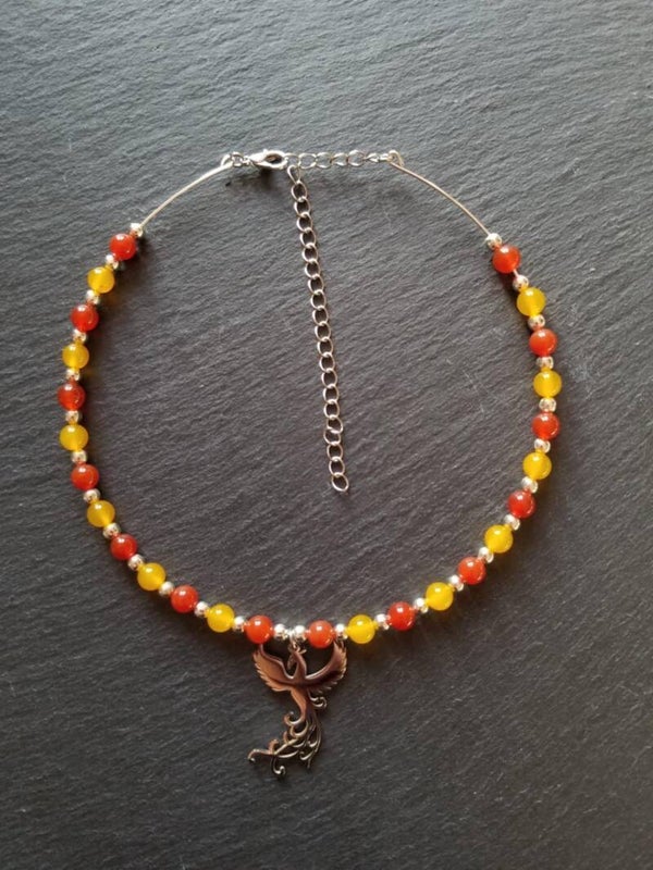 Descriptif : Collier rigide ras de cou composé de perles 6 mm en agate jaune & cornaline, éléments métalliques en acier inoxydable, réglable grâce à sa chaine d'extension de 10 cm.