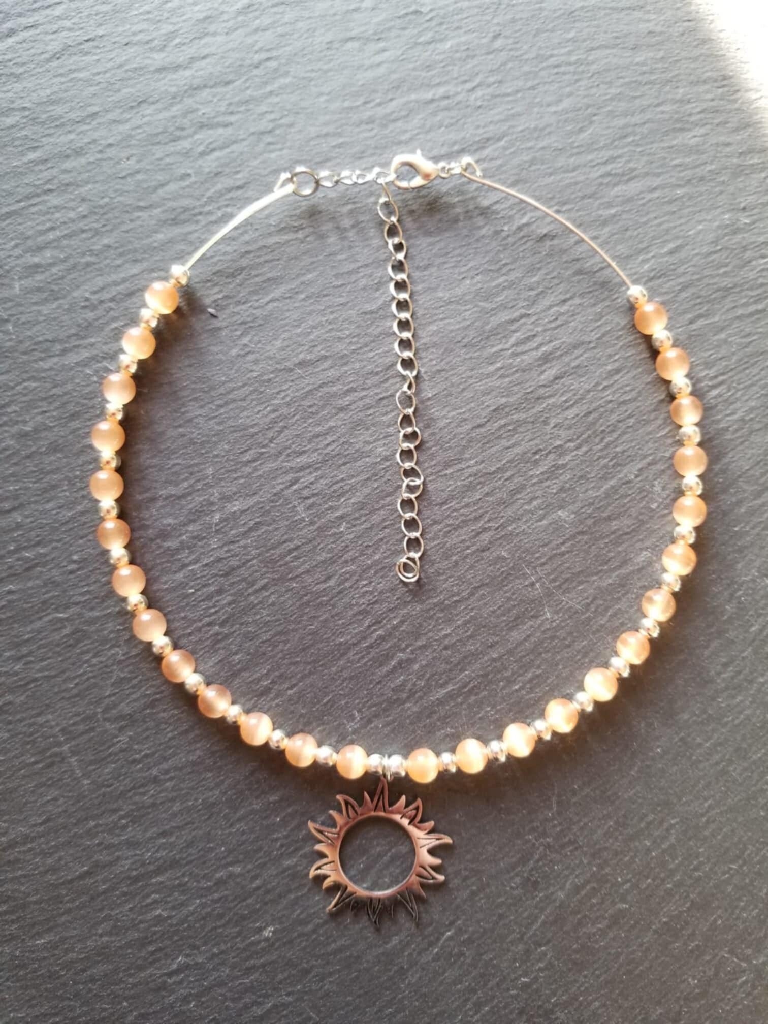 Descriptif : Collier rigide ras de cou composé de perles 6 mm en sélénite orange, éléments métalliques en acier inoxydable, réglable grâce à sa chaine d'extension de 10 cm.