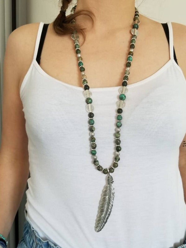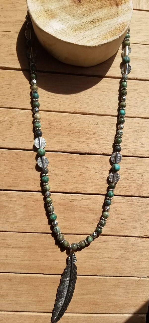 Ce collier est composé de 59 perles en 8 mm & 4 en 10 mm, d'une plume de 10 cm environ, de 14 perles 6 mm, de 38 anneaux fins, de 8 intercalaires plats et d'un fermoir en T. Monté sur fil acier solide il mesure environ 50 cm de la base du cou au bout de la plume.