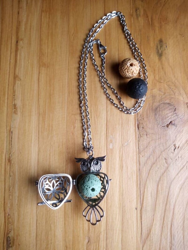 Collier boule "chouette" A l'intérieur de la cage se cache une pierre de lave en 16 mm sur laquelle vous pouvez déposer quelques gouttes d'huiles essentielles ou votre parfum préféré, vendu avec 3 pierres de lave (1 noire et 2 colorées) pour varier les plaisirs.