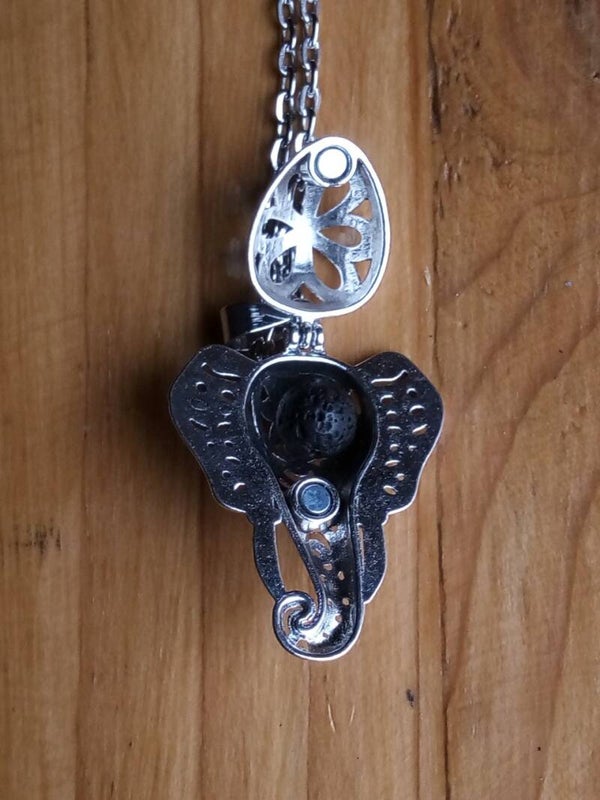 Collier boule "éléphant" - A l'intérieur de la cage se cache une pierre de lave sur laquelle vous pouvez déposer quelques gouttes d'huiles essentielles ou votre parfum préféré, vendu avec 1 pierre de lave et 1 boule colorée pour varier les plaisirs.