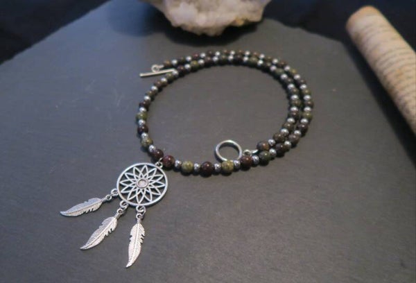 Descriptif : Collier fil acier très résistant en pierres naturelles ; 46 perles jaspe sang de dragon en 6 mm, 44 billes intercalaires & un fermoir en acier inoxydable, un pendentif attrape rêves en alliage de zinc de 5.5 cm. Longueur nuque pendentif 30 cm environ.