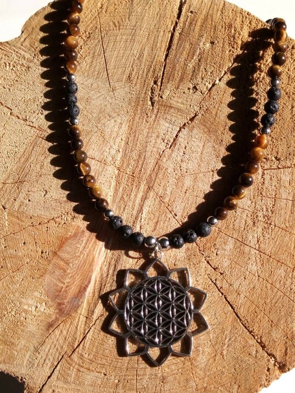 Collier fleur de vie en œil de tigre & pierre de lave