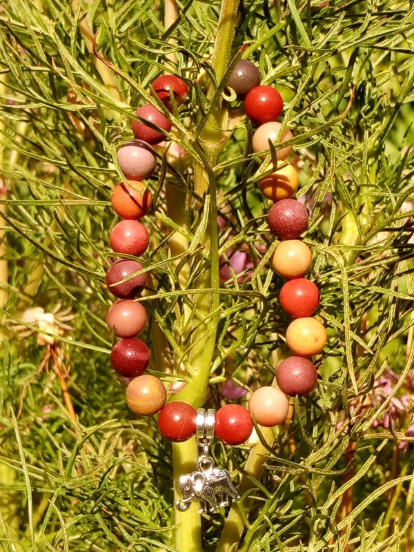 Descriptif : Bracelet sur fil élastique très résistant en pierres naturelles ; 22 perles jaspe mokaïte en 8 mm, 1 bélière & 1 breloque éléphant. 16 cm, possibilité de modifier la taille sur demande.