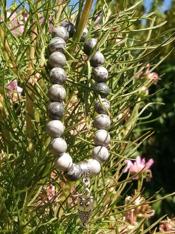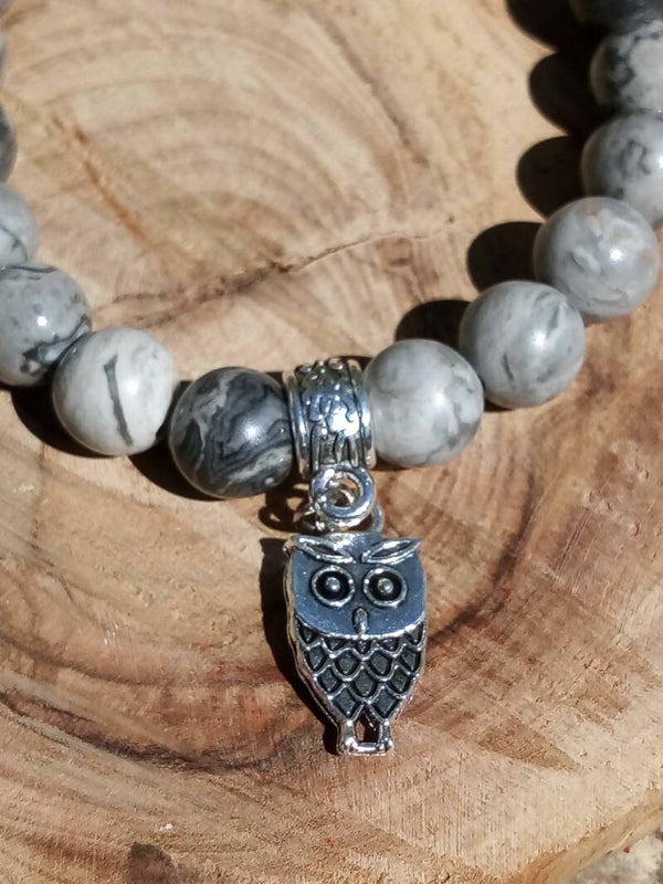 Descriptif : Bracelet sur fil élastique très résistant en pierres naturelles ; 21 perles jaspe paysage gris en 8 mm, bélière & breloque chouette. 15 cm, possibilité de modifier la taille sur demande.