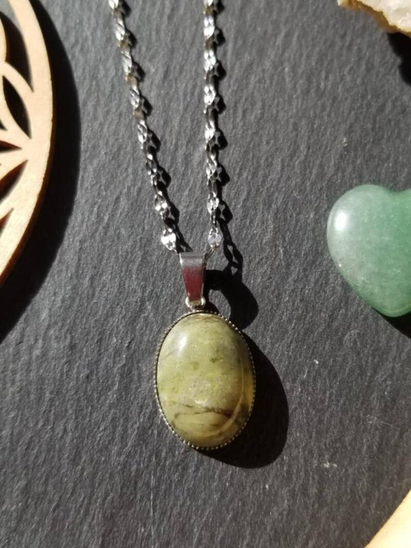 Descriptif : Cabochon rond ovale en marbre du Connemara de 18 X 13 mm monté sur chaine en acier inoxydable de 38 cm + 5 cm de rallonge. 4 modèles, choix aléatoire si non précisé à la commande