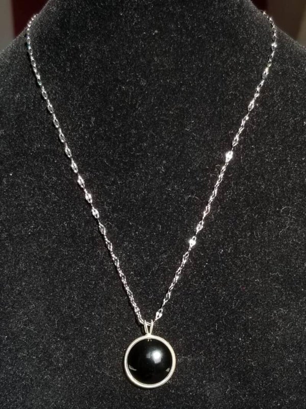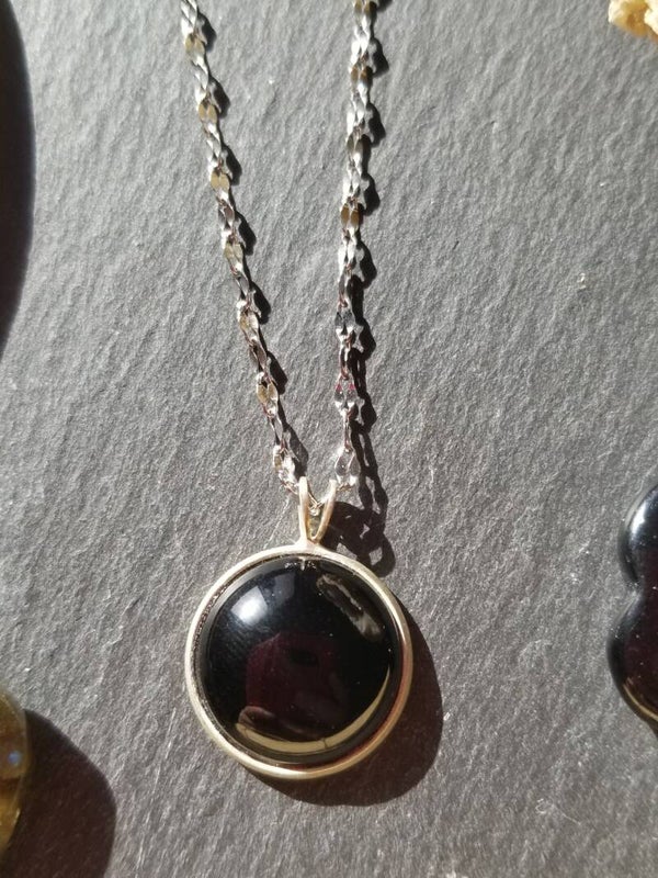 Descriptif : Cabochon rond en agate noire de 18 mm monté sur chaine en acier inoxydable de 38 cm + 5 cm de rallonge.