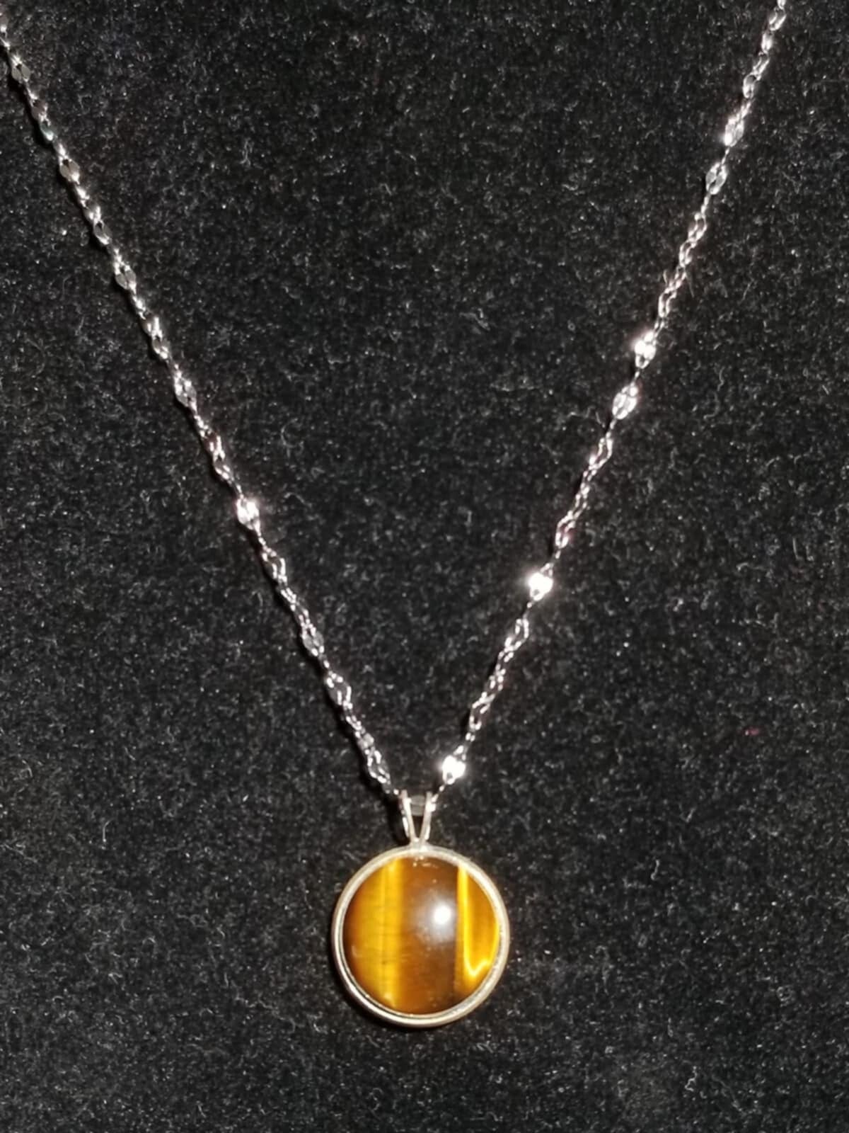 Descriptif : Cabochon rond en œil de tigre de 18 mm monté sur chaine en acier inoxydable de 38 cm + 5 cm de rallonge.